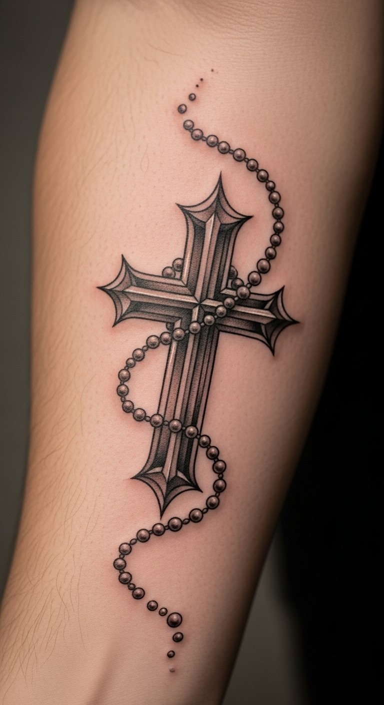 This tattoo symbolizes deep faith and spiritual devotion, intertwining the sacredness of the cross with the significance of the rosary.