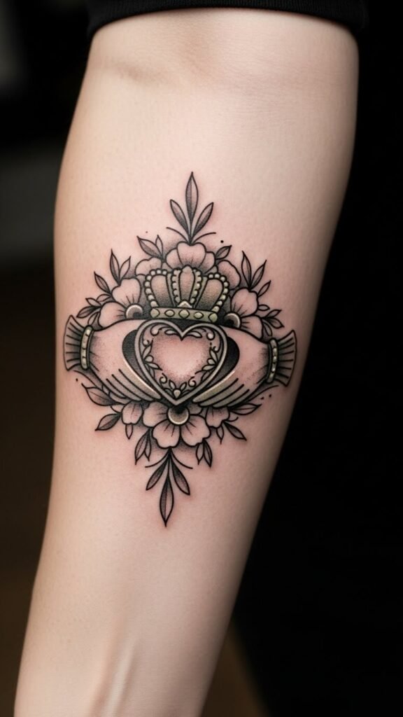The Claddagh ring tattoo on the inner forearm symbolizes love, loyalty, and friendship, serving as a constant reminder of deep connections.