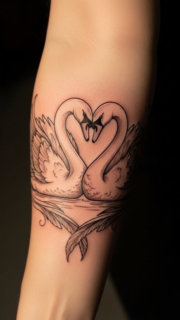 The swan tattoo represents a profound commitment and the beauty of true love, capturing the essence of a soulmate connection. Placed on the forearm, it serves as a constant reminder of the bond shared between partners, easily visible and accessible for admiration. The gentle curves of the swans evoke a sense of harmony and peace, making this tattoo a heartfelt tribute to the journey taken together.