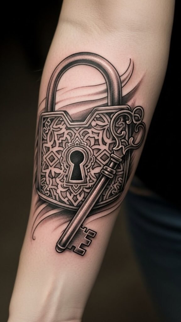 This enchanting lock and key tattoo beautifully symbolizes the profound emotional connection between soulmates, each holding the key to the other’s heart.
