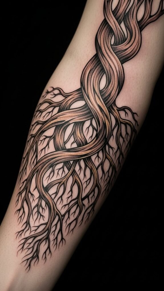 The intricate details of the leaves and roots reflect the unique aspects of each relationship, while the natural skin tone and mild texture enhance the realism, creating a striking piece of art that resonates emotionally and spiritually.