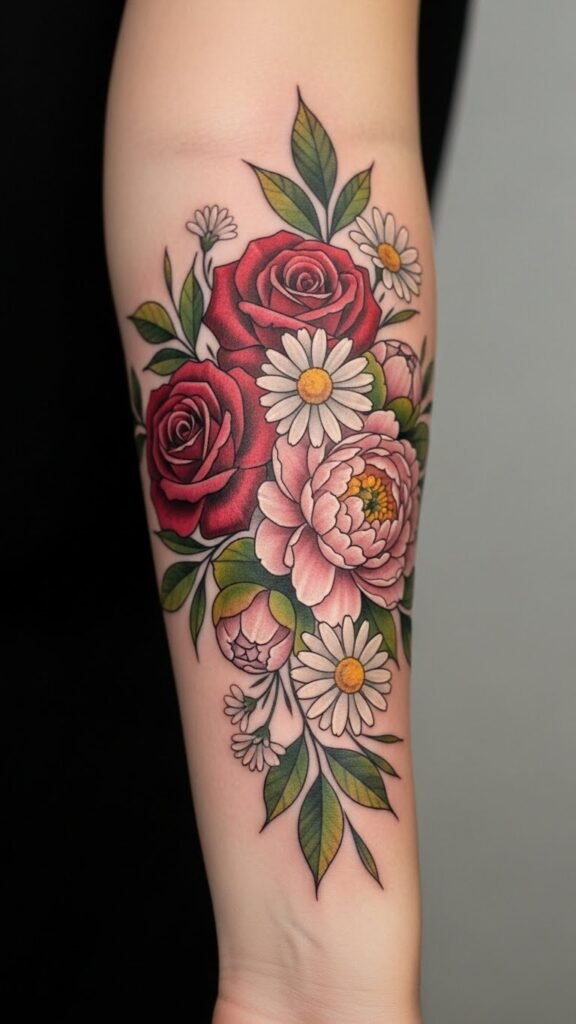 The vibrant colors and meaningful floral choices reflect the richness of the relationship, while the natural lighting and skin tone add to the tattoo’s realism, making it a personal and artistic homage to love and connection.