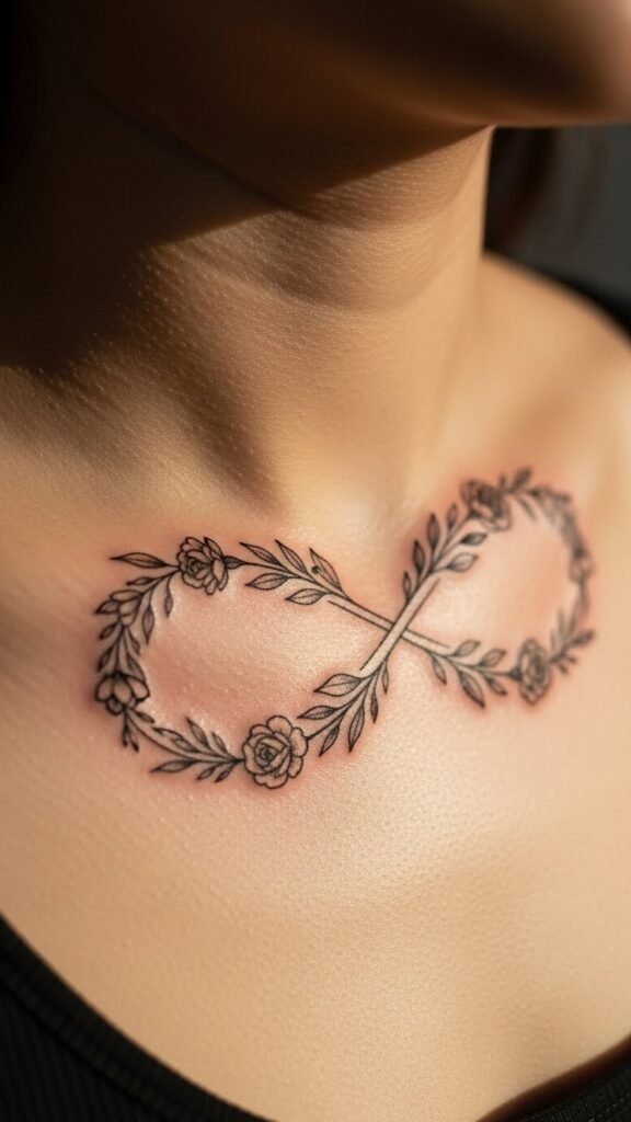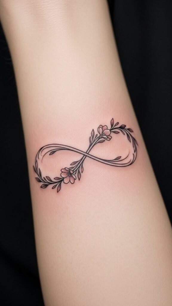 The infinity symbol tattoo, adorned with floral motifs, represents endless love and eternal connection, symbolizing a journey shared between two individuals.