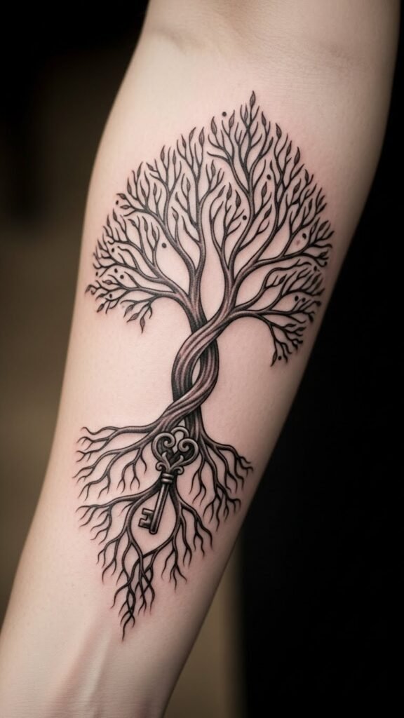 The placement on the forearm allows for visibility, enabling the wearer to express their love openly. The intertwined trees represent growth and strength in their relationship, while the lock and key signify trust and security.