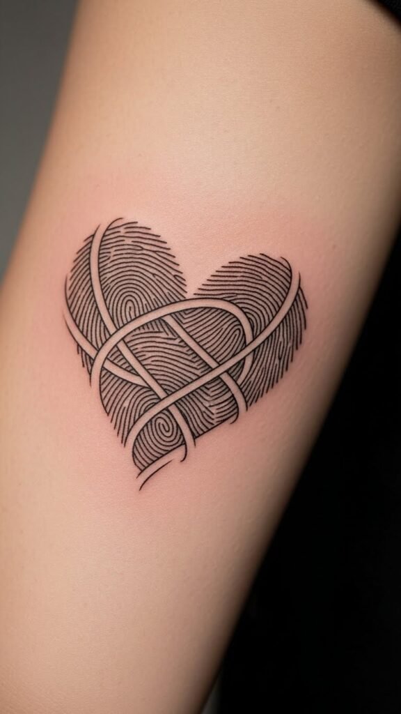 The intertwining fingerprints signify individuality while the heart shape highlights love and unity.
