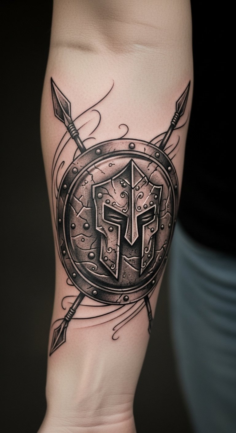 This tattoo design symbolizes the core values of Spartan culture—strength, loyalty, and courage.