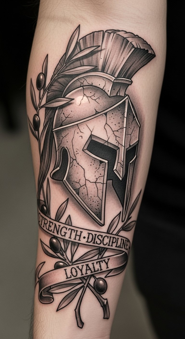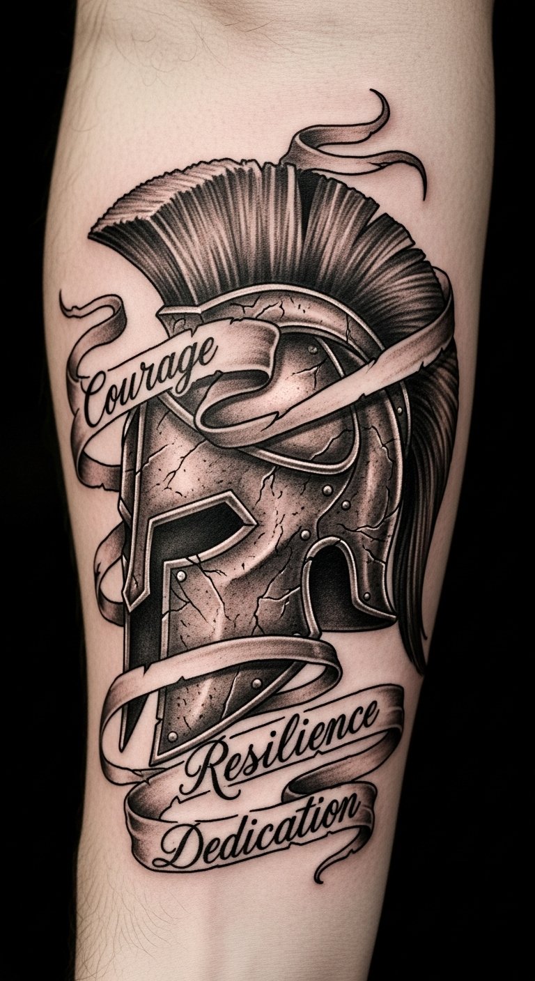 This tattoo, placed on the forearm, symbolizes the core values of a warrior’s spirit. The Spartan helmet represents strength and valor, while the flowing banner serves as a reminder of the personal mantras that guide one’s life.