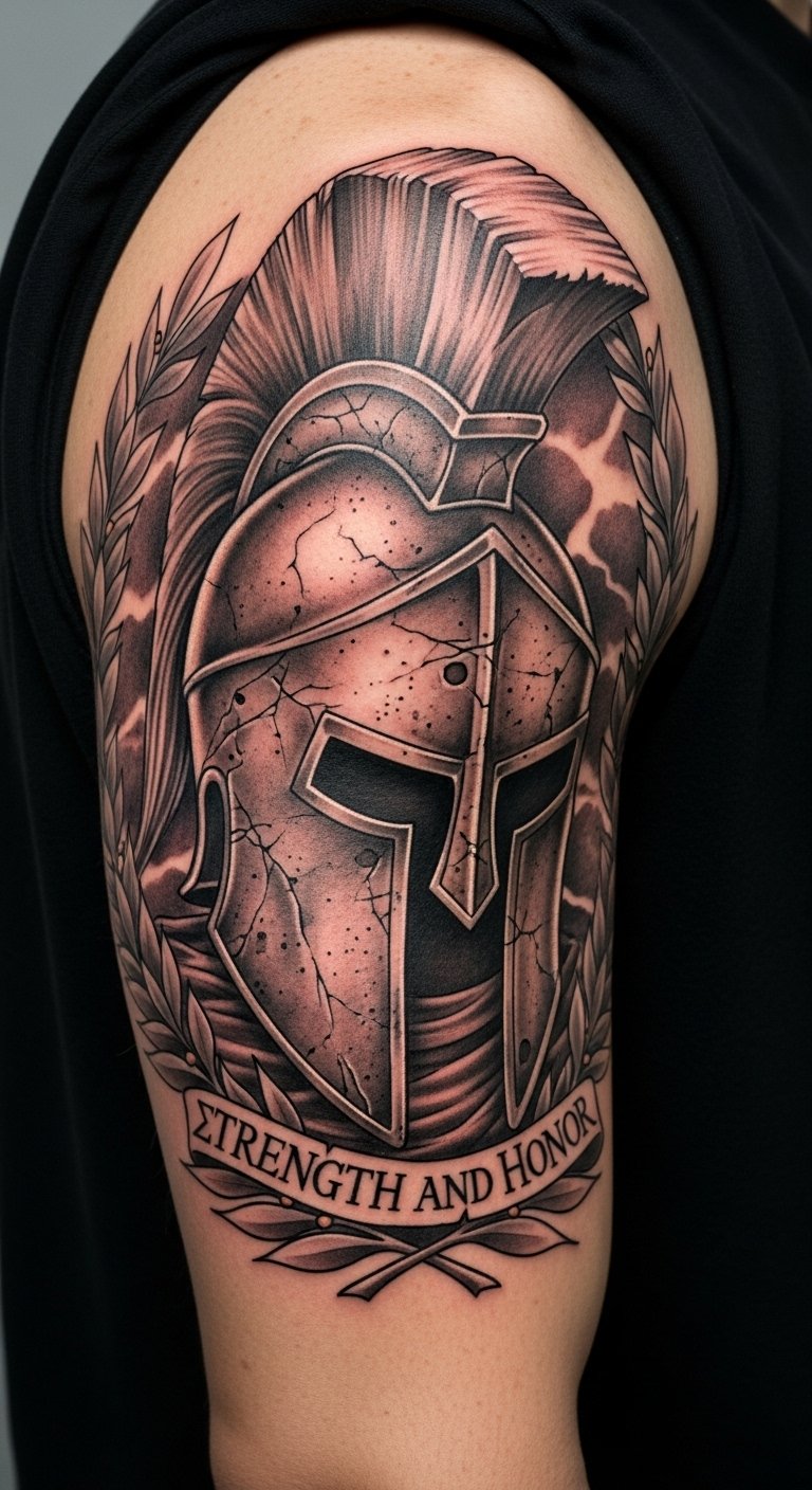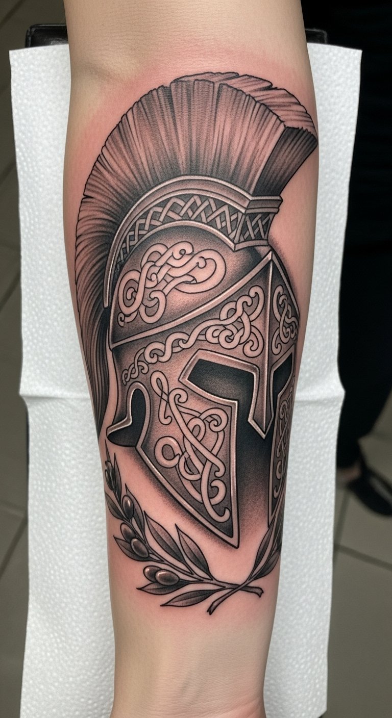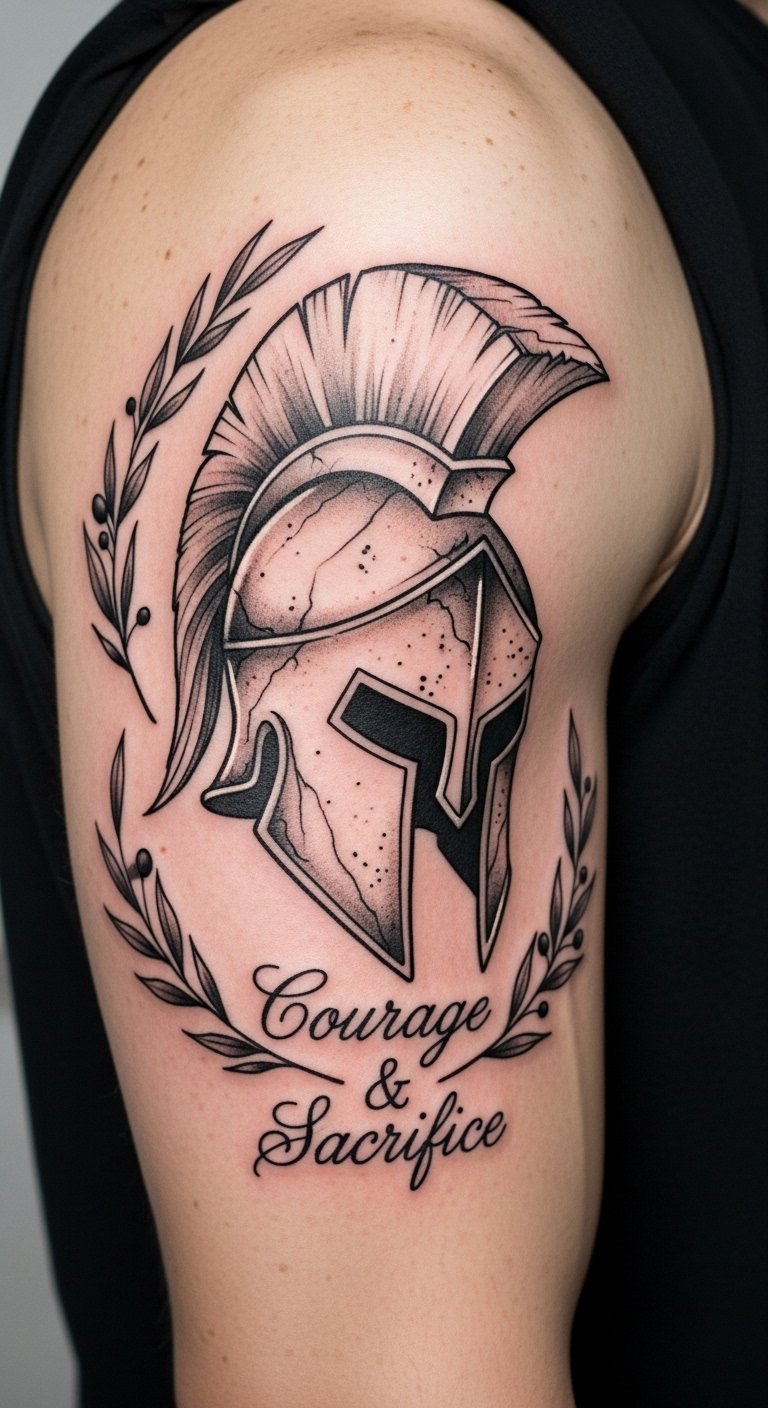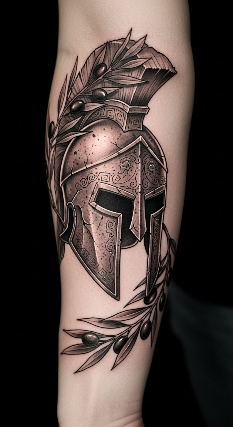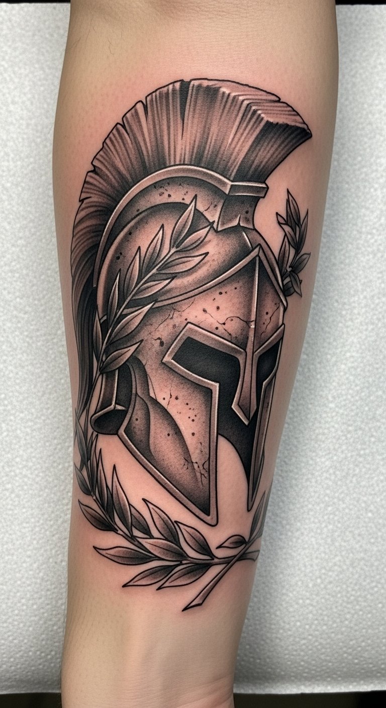 This tattoo symbolizes resilience and strength, embodying the essence of Spartan culture. The helmet represents courage in the face of adversity, while the laurel leaves signify victory and honor.