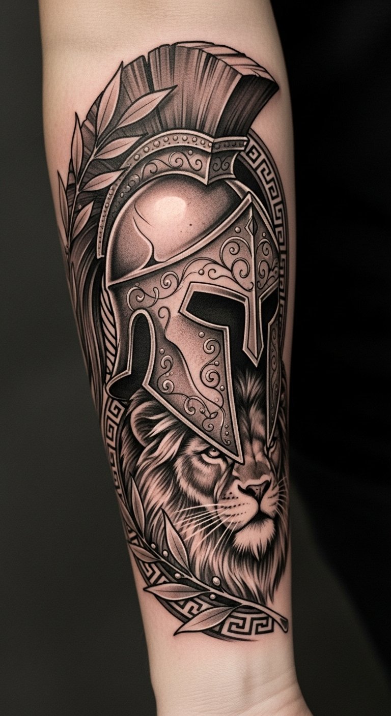 This tattoo embodies the essence of strength and resilience, central to the Spartan ethos. The Spartan helmet represents bravery and honor, while the lion’s head signifies ferocity and leadership.