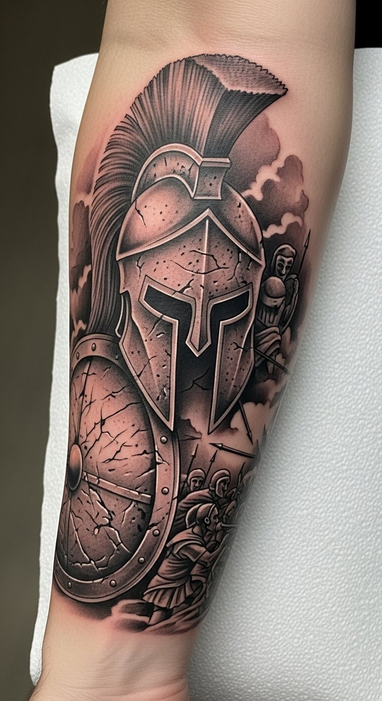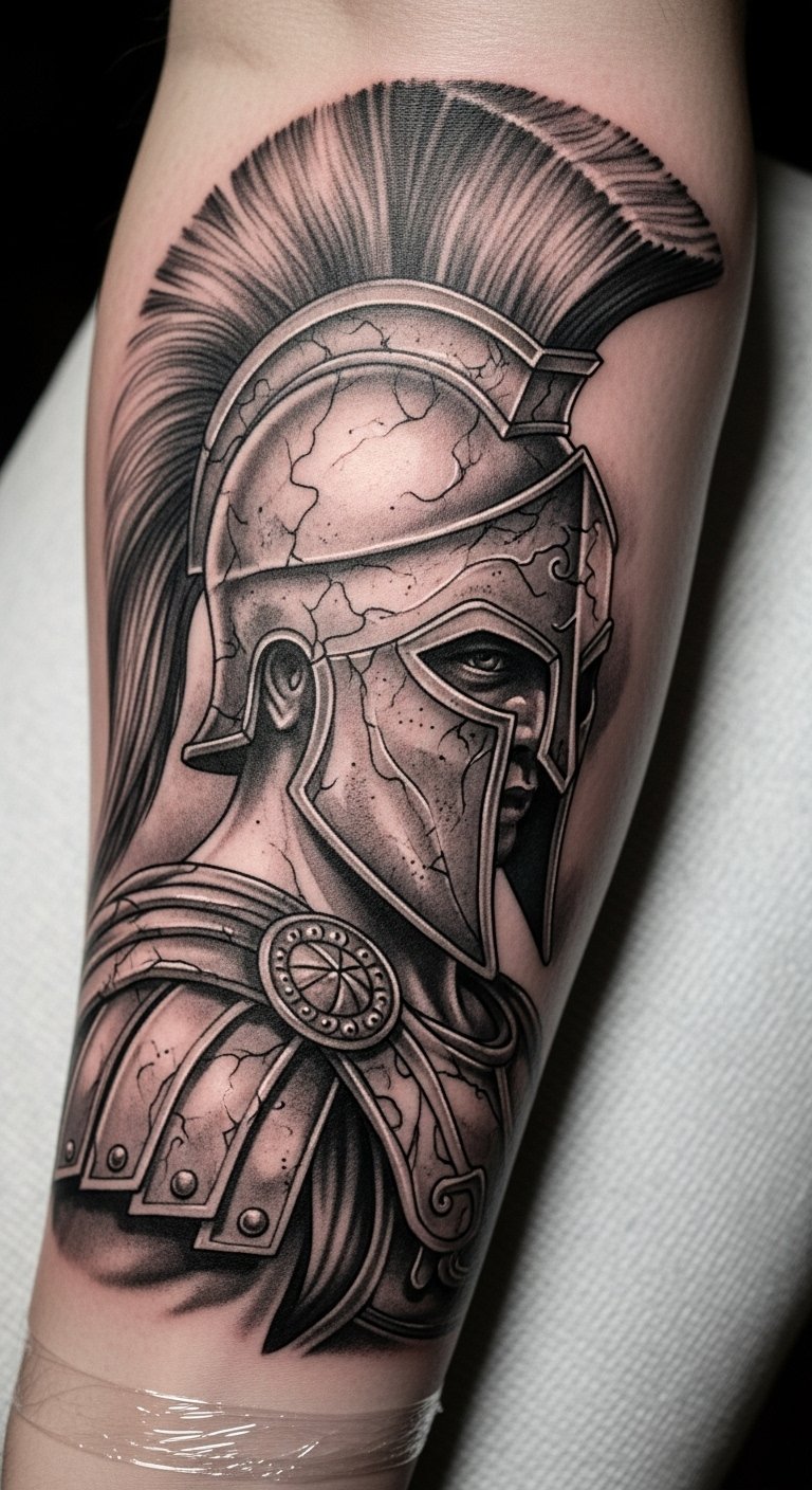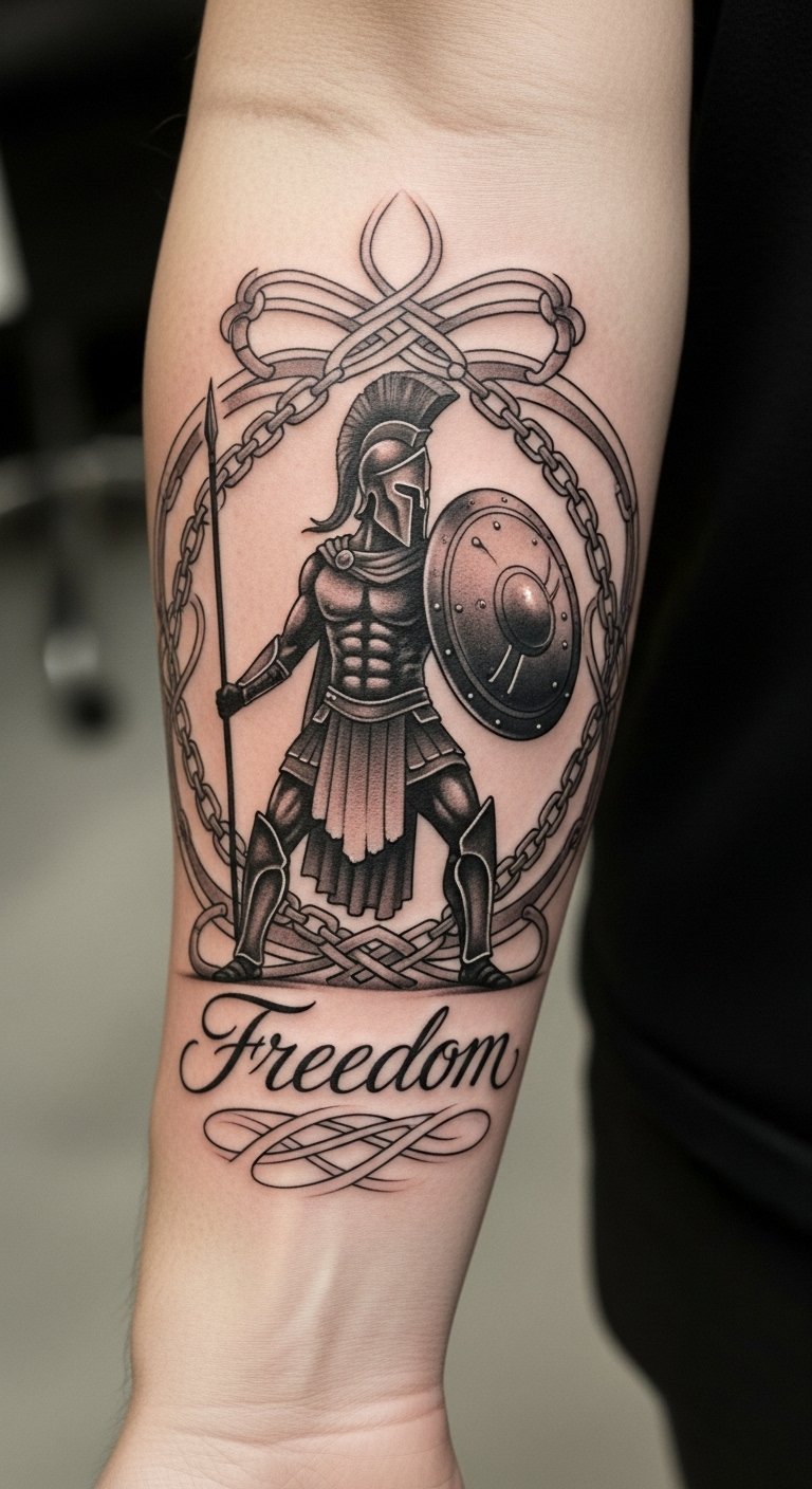 The tattoo symbolizes the strength and bravery of a Spartan warrior, representing the spirit of resilience and the relentless pursuit of freedom.