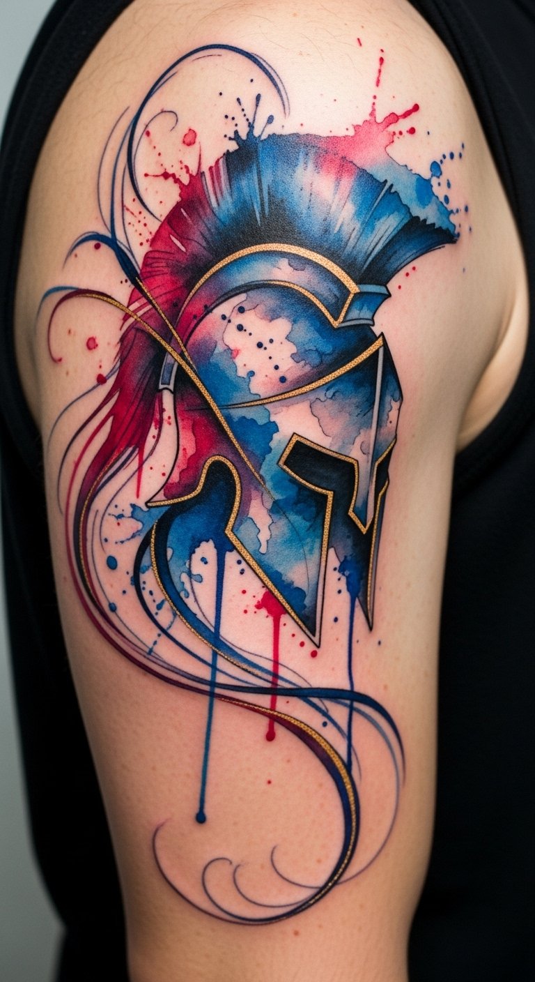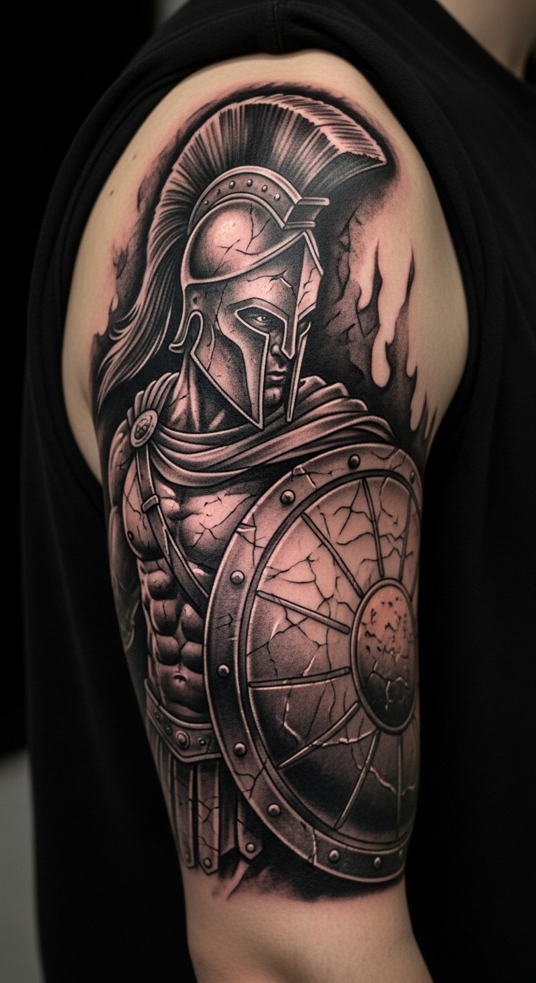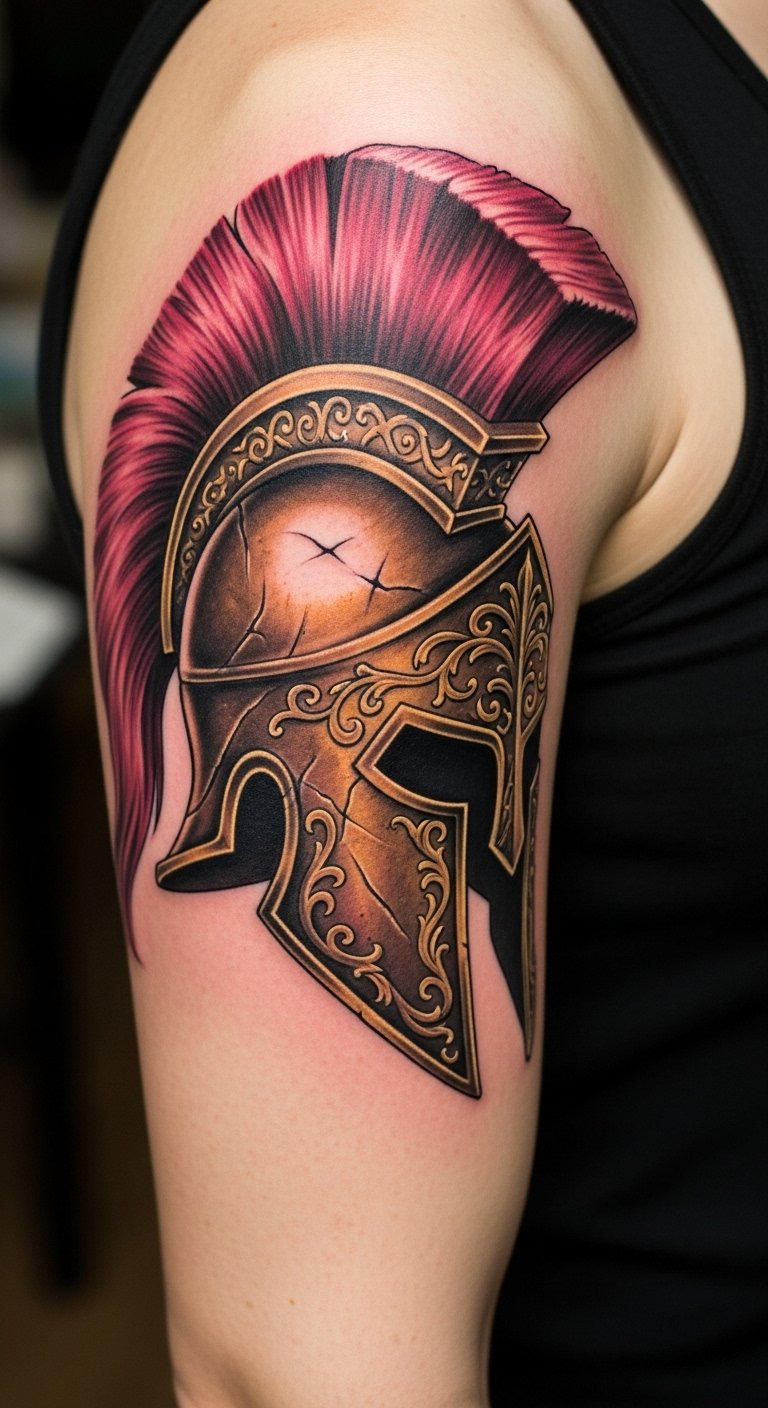 The tattoo symbolizes the strength and bravery of a Spartan warrior, representing the spirit of resilience and the relentless pursuit of freedom.