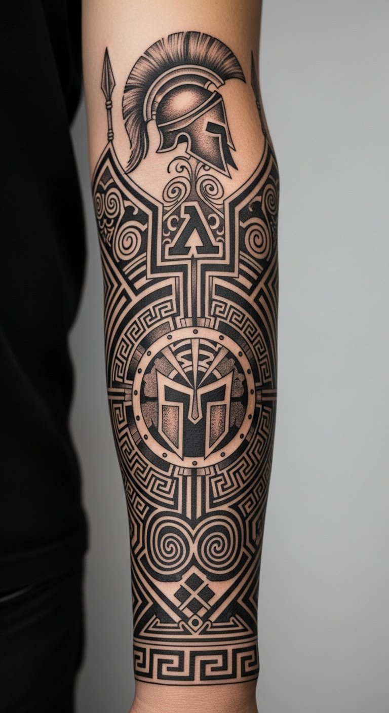 In this design, the Greek patterns symbolize the enduring strength and artistry of ancient cultures, while the Spartan elements evoke a sense of bravery and resilience.