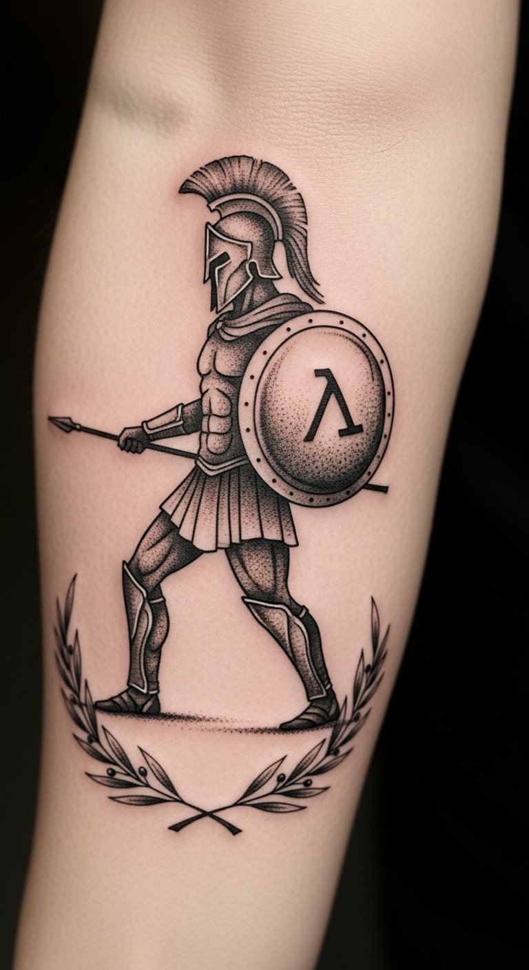 The tattoo represents the deep-rooted values of loyalty to both family and state, encapsulating the essence of the Spartan warrior ethos.