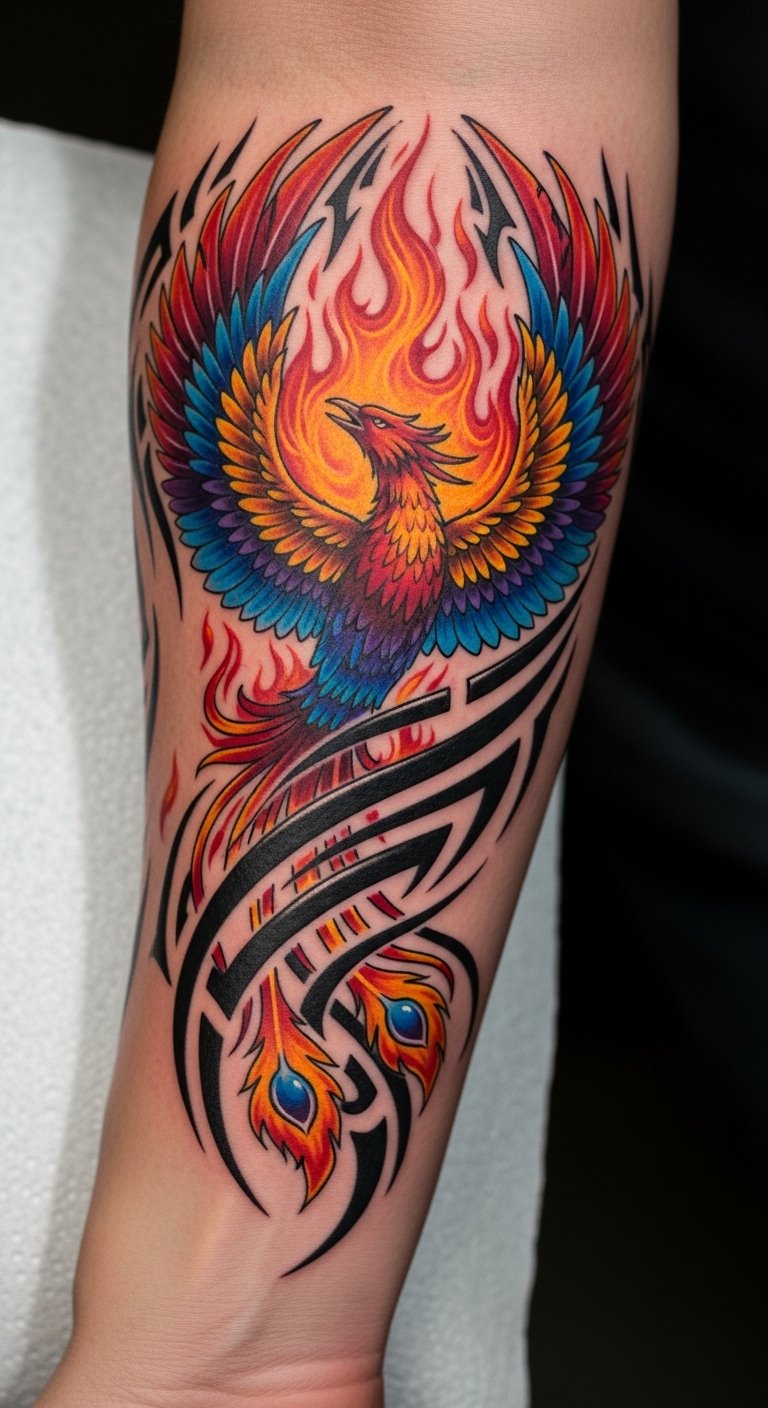This tattoo design embodies the essence of inner strength, representing rebirth and the warrior spirit through the phoenix motif. The flames symbolize challenges faced and overcome, while the tribal patterns pay homage to cultural heritage and pride.