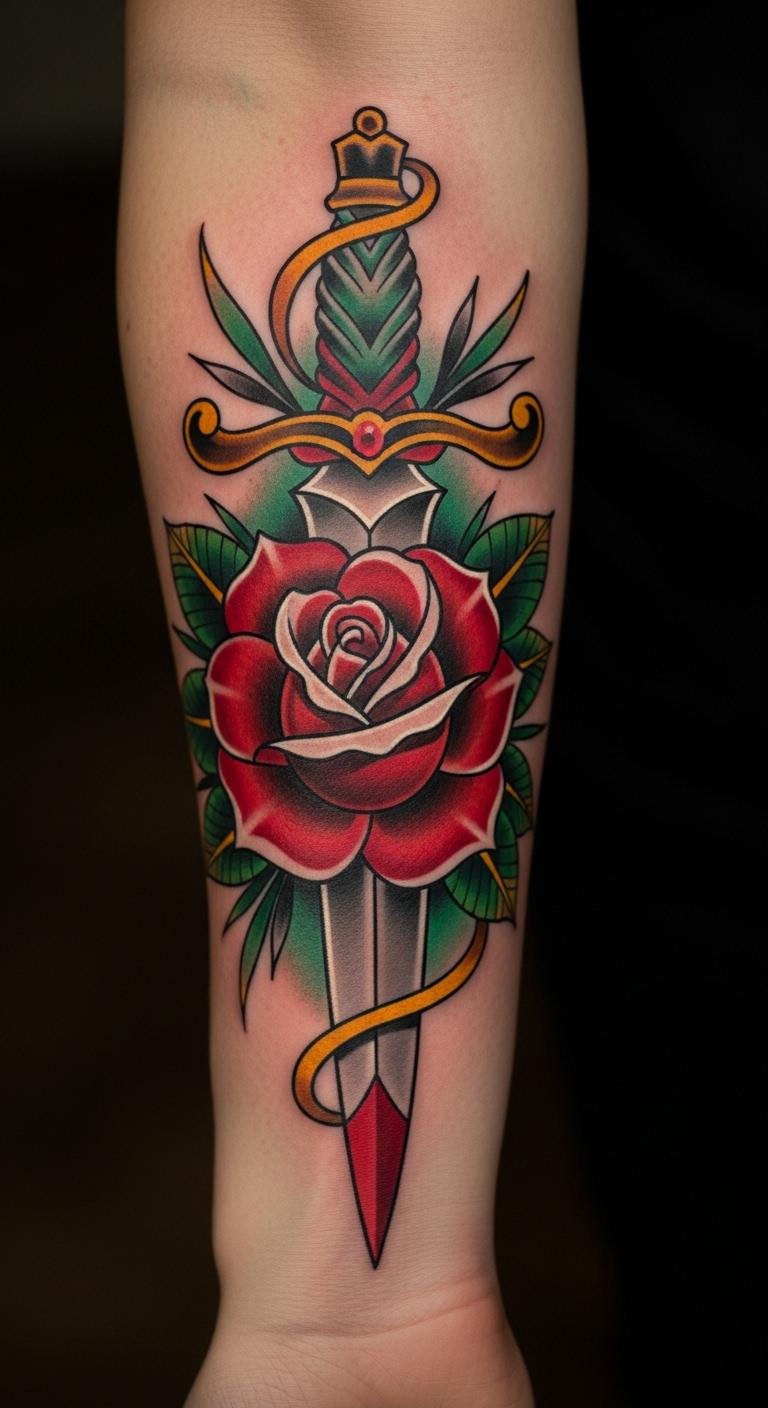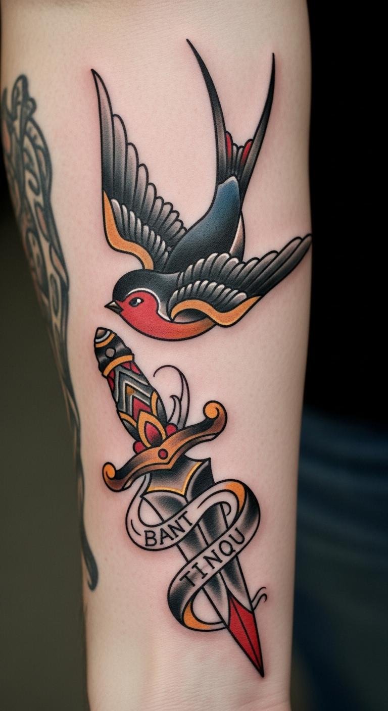 The swallow and dagger tattoo carries profound meanings, embodying the spirit of adventure and resilience.