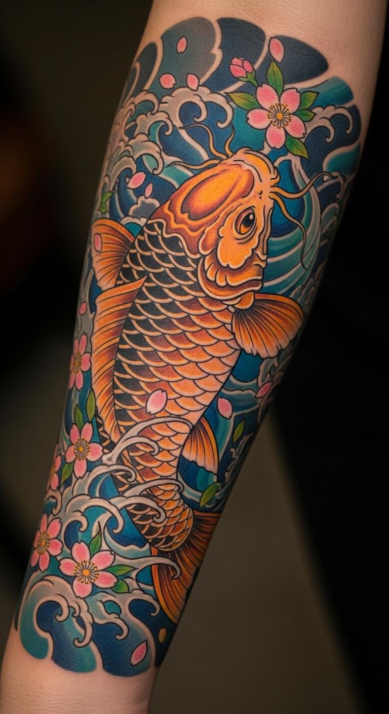 The koi fish symbolizes perseverance and determination, making it an excellent choice for those who have overcome challenges. Positioned on the forearm, this tattoo serves as a constant reminder of resilience, easily visible to inspire and motivate. The addition of cherry blossoms signifies the beauty of life and its fleeting nature, while the waves represent the journey through life’s ups and downs. This harmonious design not only enhances the aesthetics of the arm but also tells a powerful personal story.