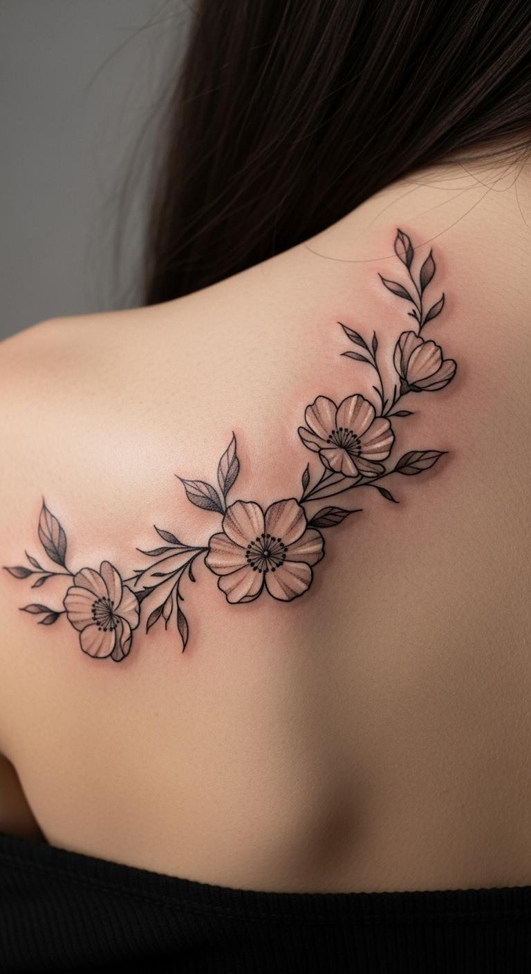 This tattoo symbolizes growth and femininity, with the floral elements representing beauty and the intertwining vines signifying connection and strength.