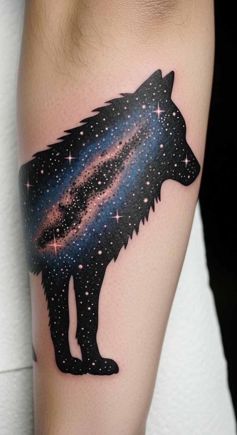The night sky created through negative space adds a layer of mystique, representing exploration and the pursuit of dreams. Placed on the forearm, it serves as a constant reminder of resilience and individuality, visible to the wearer and others, fostering a connection to the untamed aspects of life.