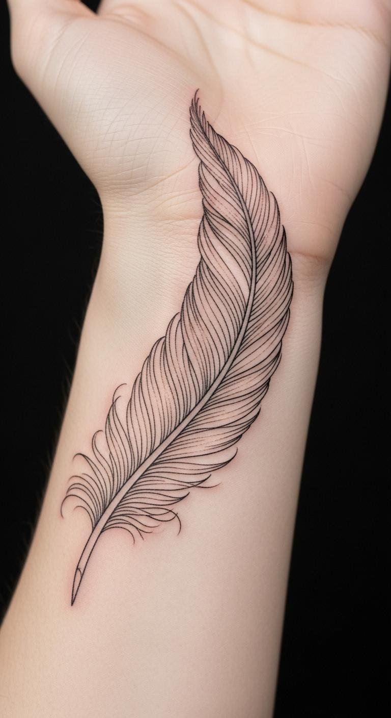The feather symbolizes freedom and lightness, embodying the spirit of flight and the pursuit of dreams. Its placement on the wrist allows for easy visibility, serving as a constant reminder of personal aspirations and the importance of staying grounded in one’s journey.