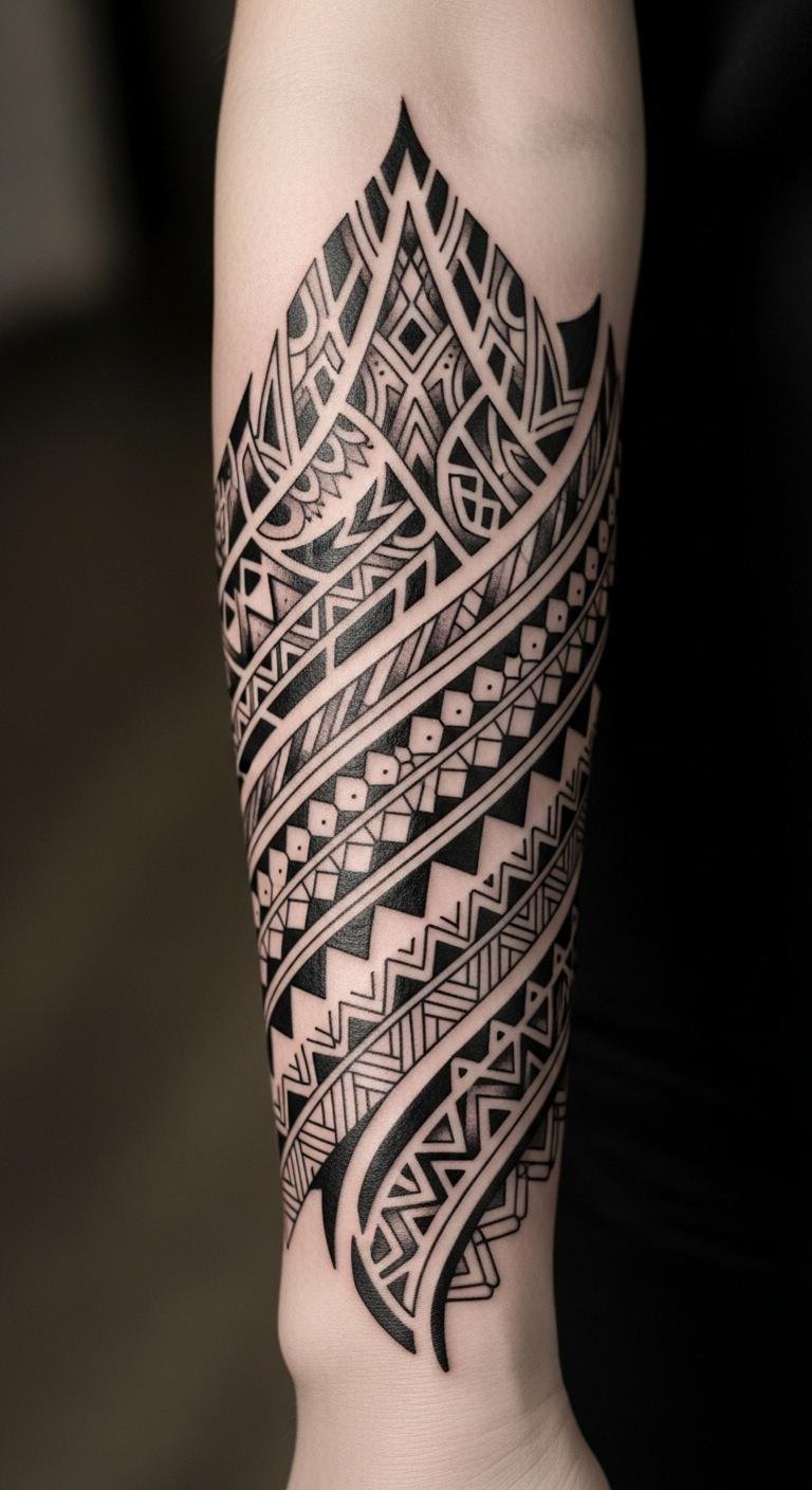 The bold lines and geometric shapes symbolize the unity of past and present, celebrating identity and freedom. Positioned on the forearm, it serves as a constant reminder of resilience and artistic expression, making it not just a piece of art, but a significant aspect of the wearer’s narrative.