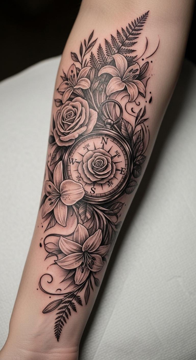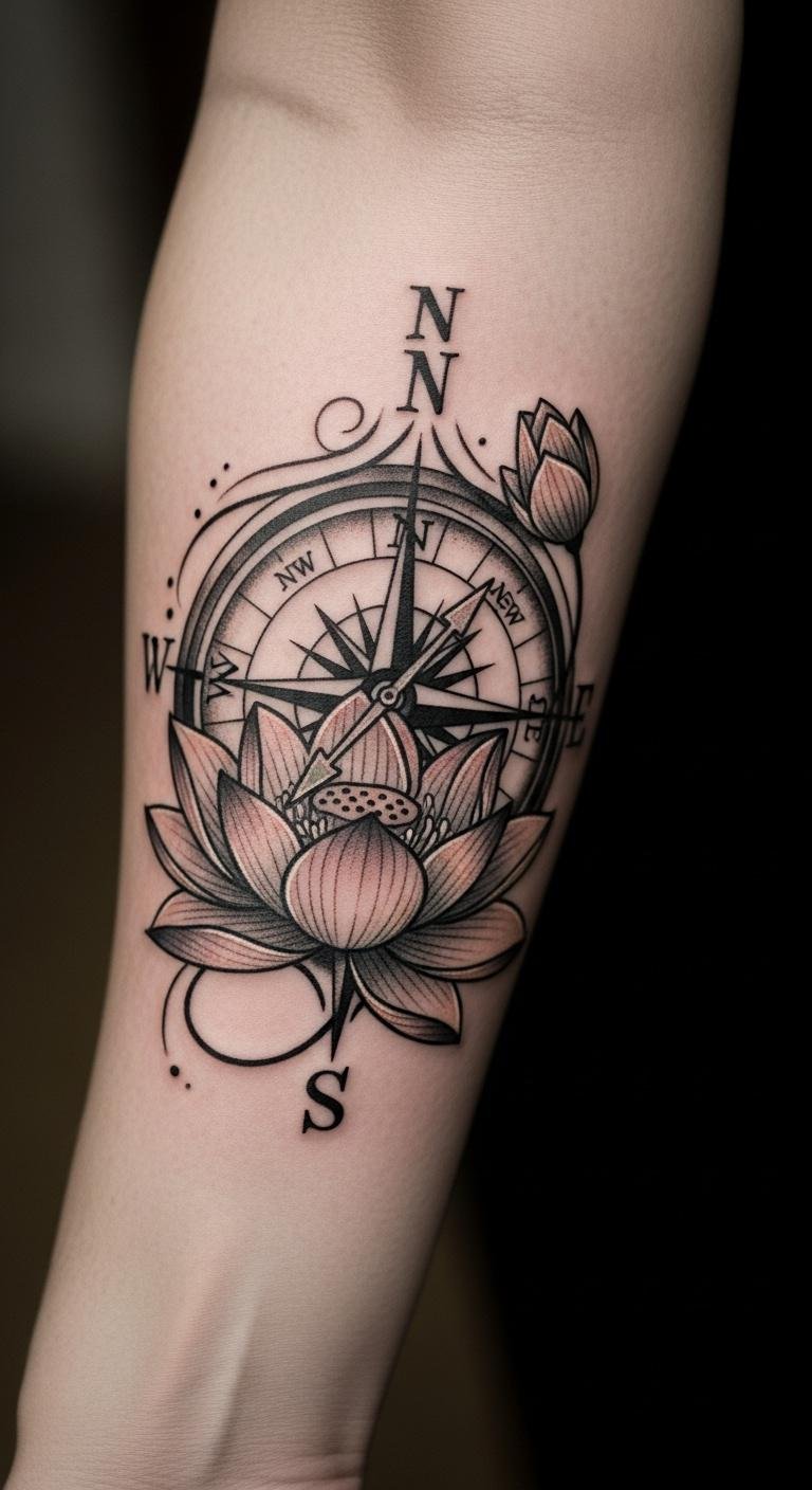 The compass and lotus tattoo on the forearm embodies a journey of self-discovery and personal growth. The compass signifies the quest for purpose and direction, reflecting one’s beliefs and aspirations, while the lotus flower symbolizes resilience and beauty emerging from adversity.