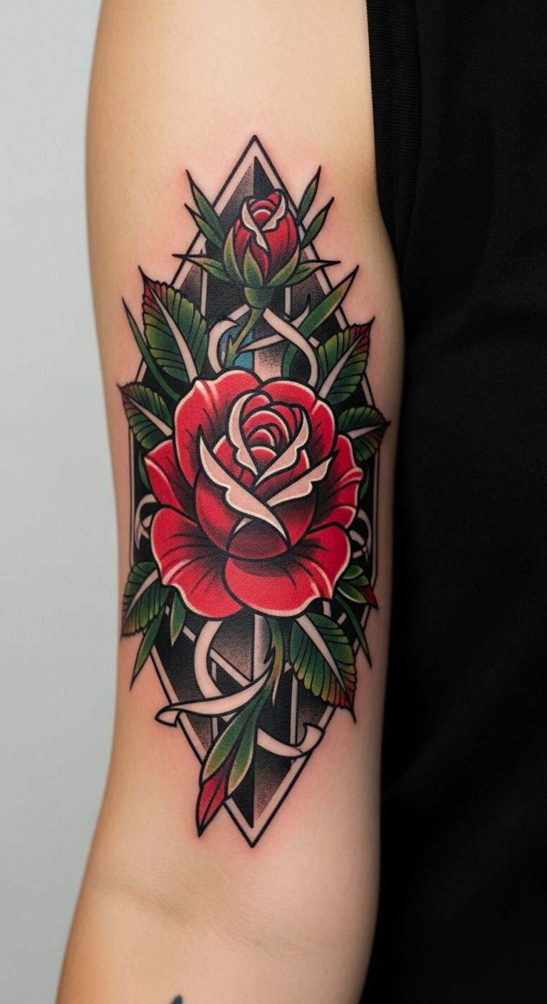 This tattoo design symbolizes beauty and resilience, merging classic floral imagery with modern geometric elements that represent the fusion of tradition and contemporary life.