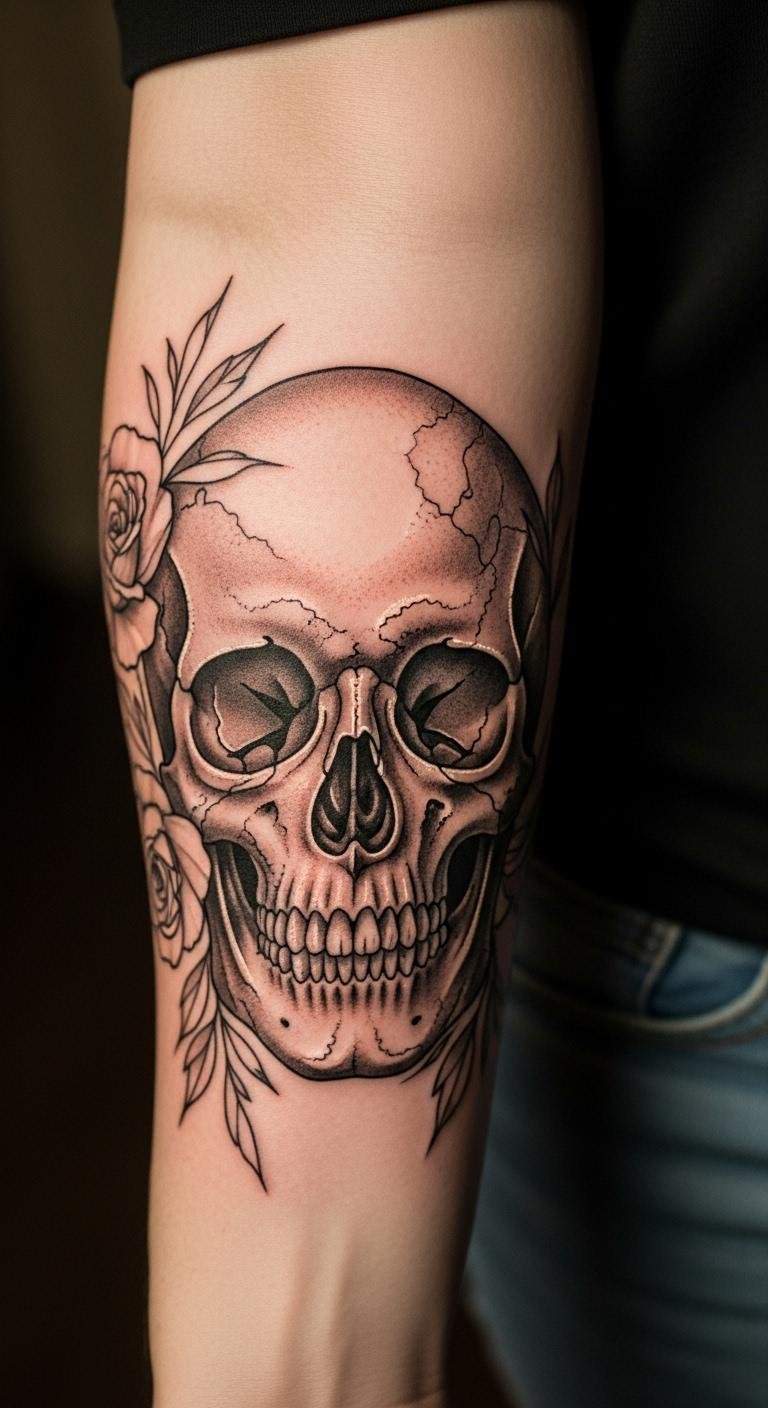 This tattoo embodies a powerful narrative of transformation and resilience, merging the stark imagery of the skull with the delicate beauty of flowers.
