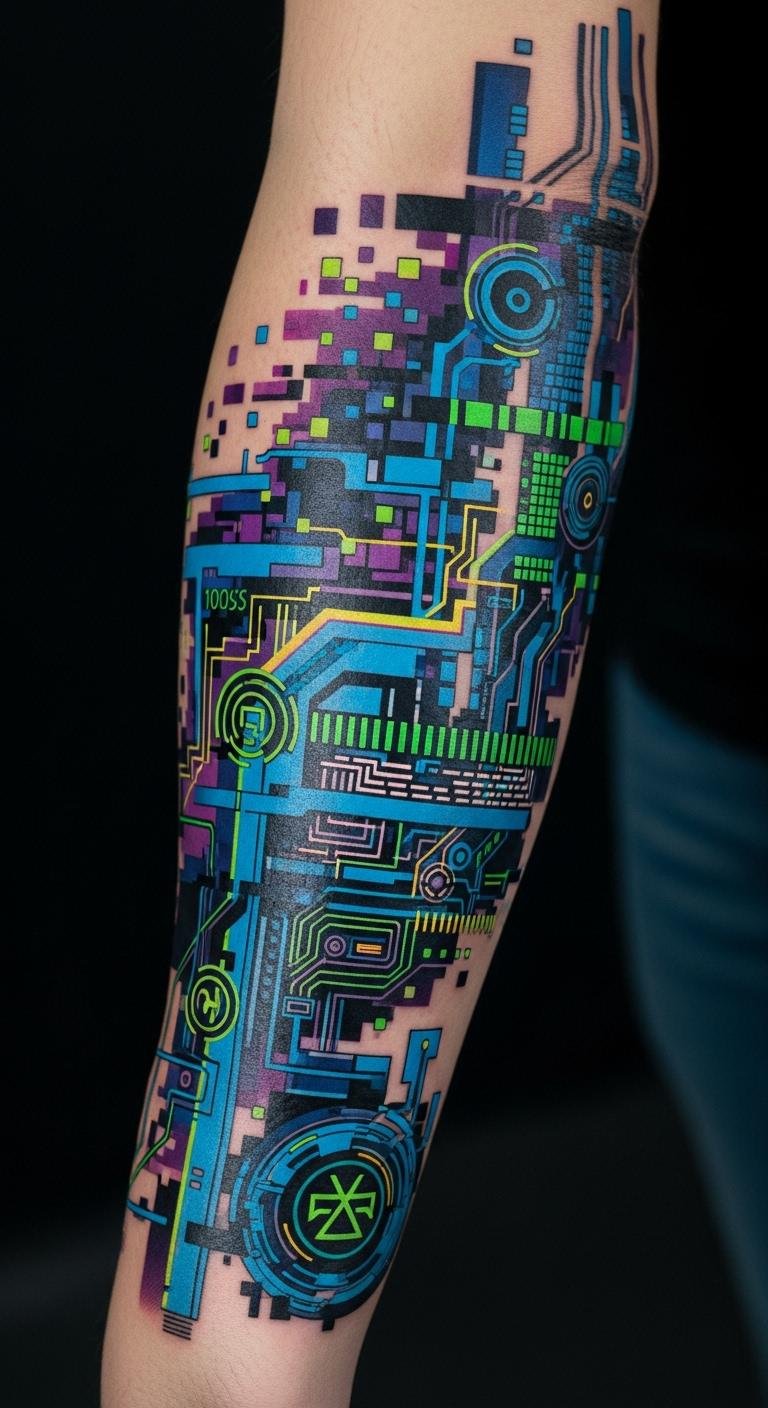 Positioned on the forearm, it serves as a constant reminder of the wearer’s connection to cyber culture, encouraging introspection and exploration of self in a rapidly evolving world. The bold colors and intricate patterns evoke emotions of creativity and innovation, making it a striking testament to the fusion of art and technology.