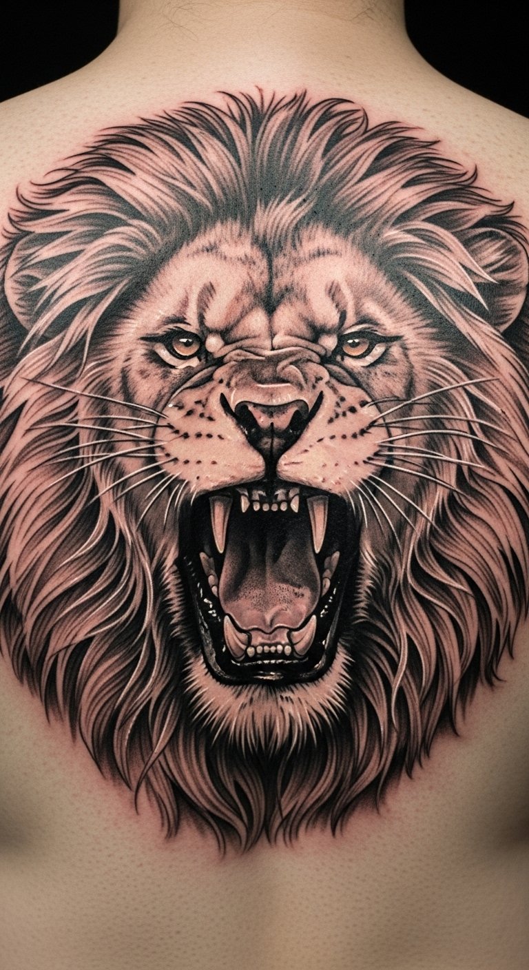 This lion tattoo, positioned on the upper back, serves as a powerful reminder of inner resilience and the courage one carries within.