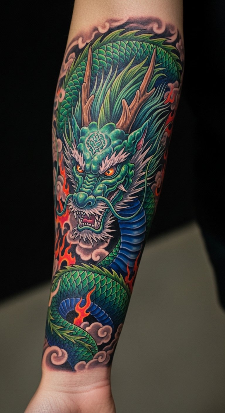 This dragon tattoo symbolizes transformation and resilience, embodying the wearer’s journey through challenges and personal growth.