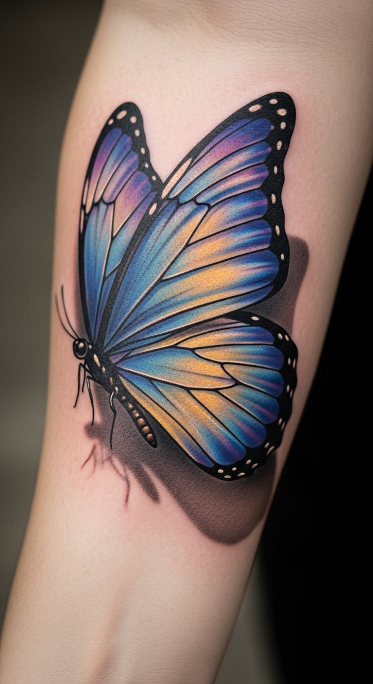 The butterfly tattoo symbolizes rebirth and freedom, representing a journey of personal transformation.