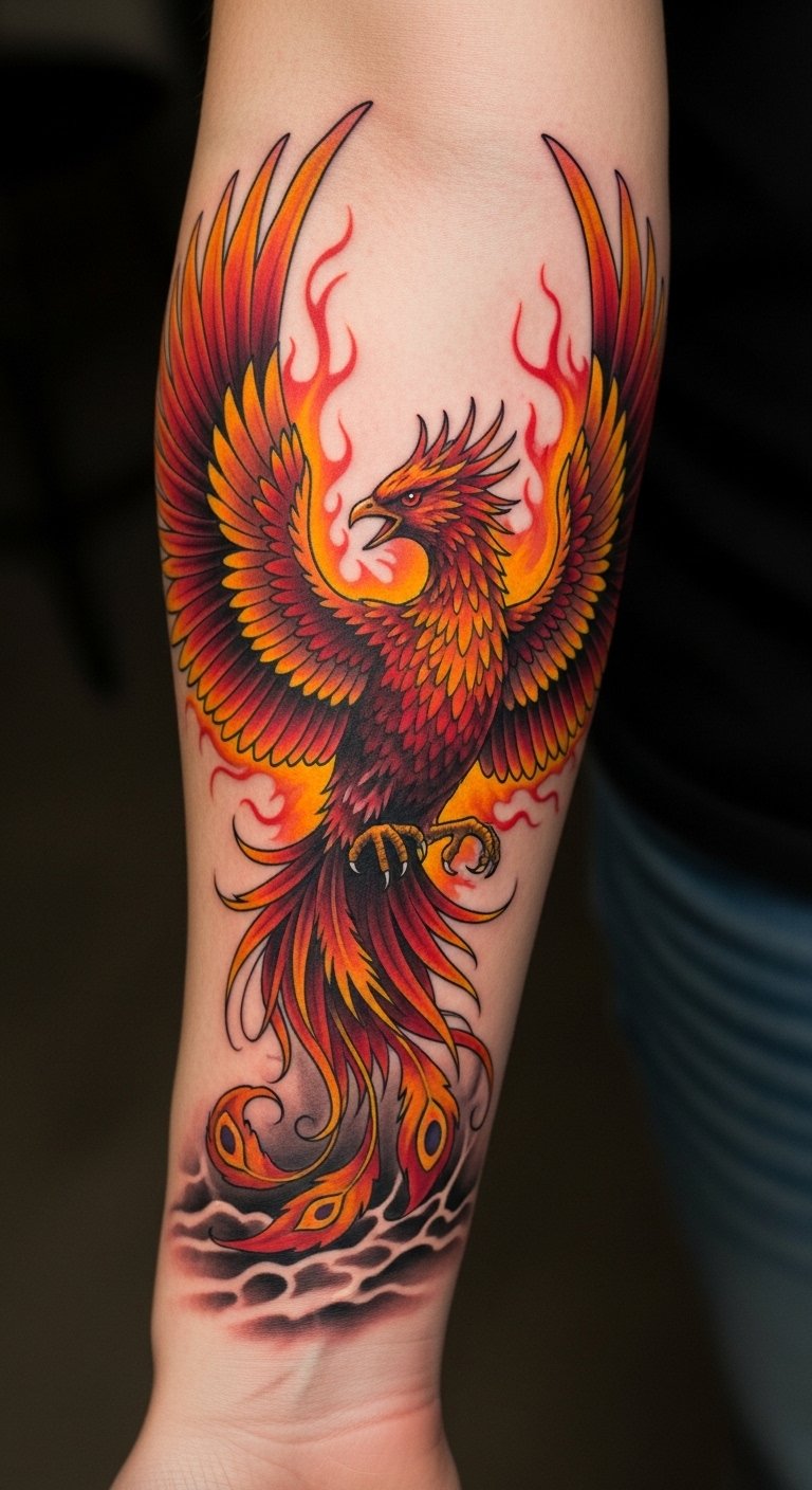 The phoenix tattoo embodies the essence of rebirth and transformation. Positioned on the forearm, this tattoo serves as a constant reminder of resilience and strength, visible to the wearer and those around them.