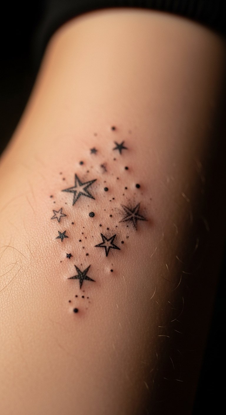 This star tattoo, nestled on the inner forearm, symbolizes guidance and aspiration, serving as a constant reminder to pursue one’s dreams.