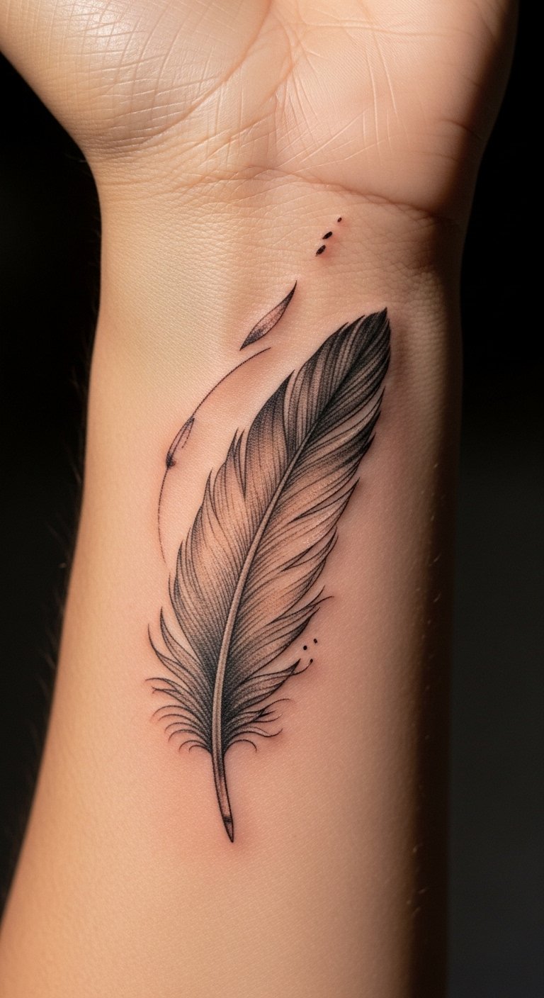This feather tattoo, placed on the wrist, symbolizes freedom and lightness, embodying the spirit of adventure and the courage to rise above life’s challenges.