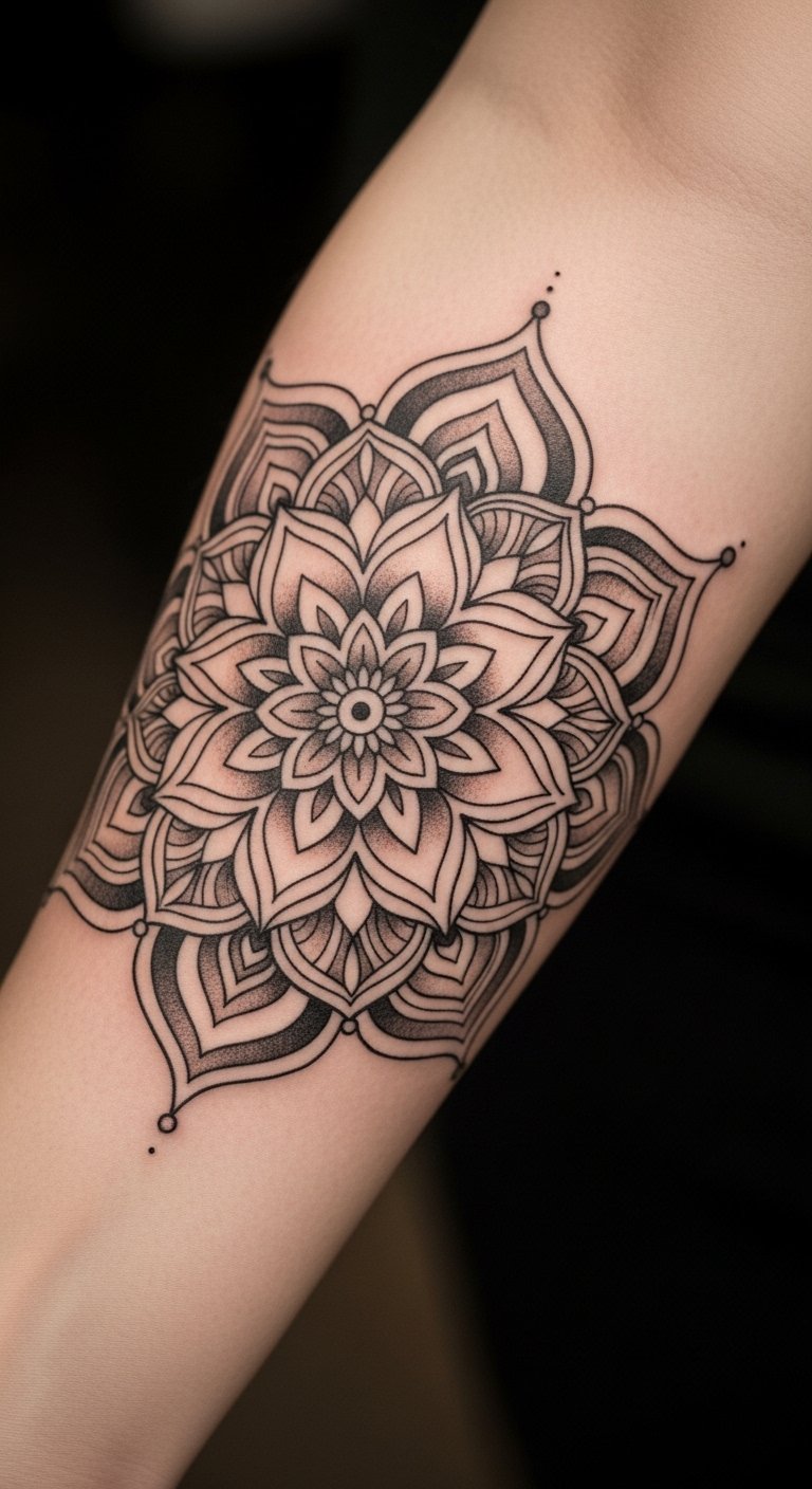 This mandala tattoo on the forearm symbolizes balance and harmony, inviting a sense of peace into daily life.