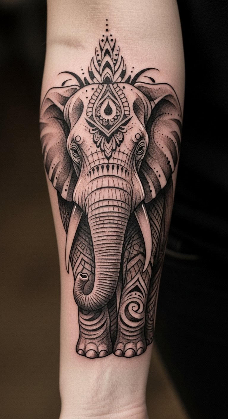 This elephant tattoo serves as a powerful emblem of resilience, wisdom, and strength, seamlessly blending into the skin of the forearm.