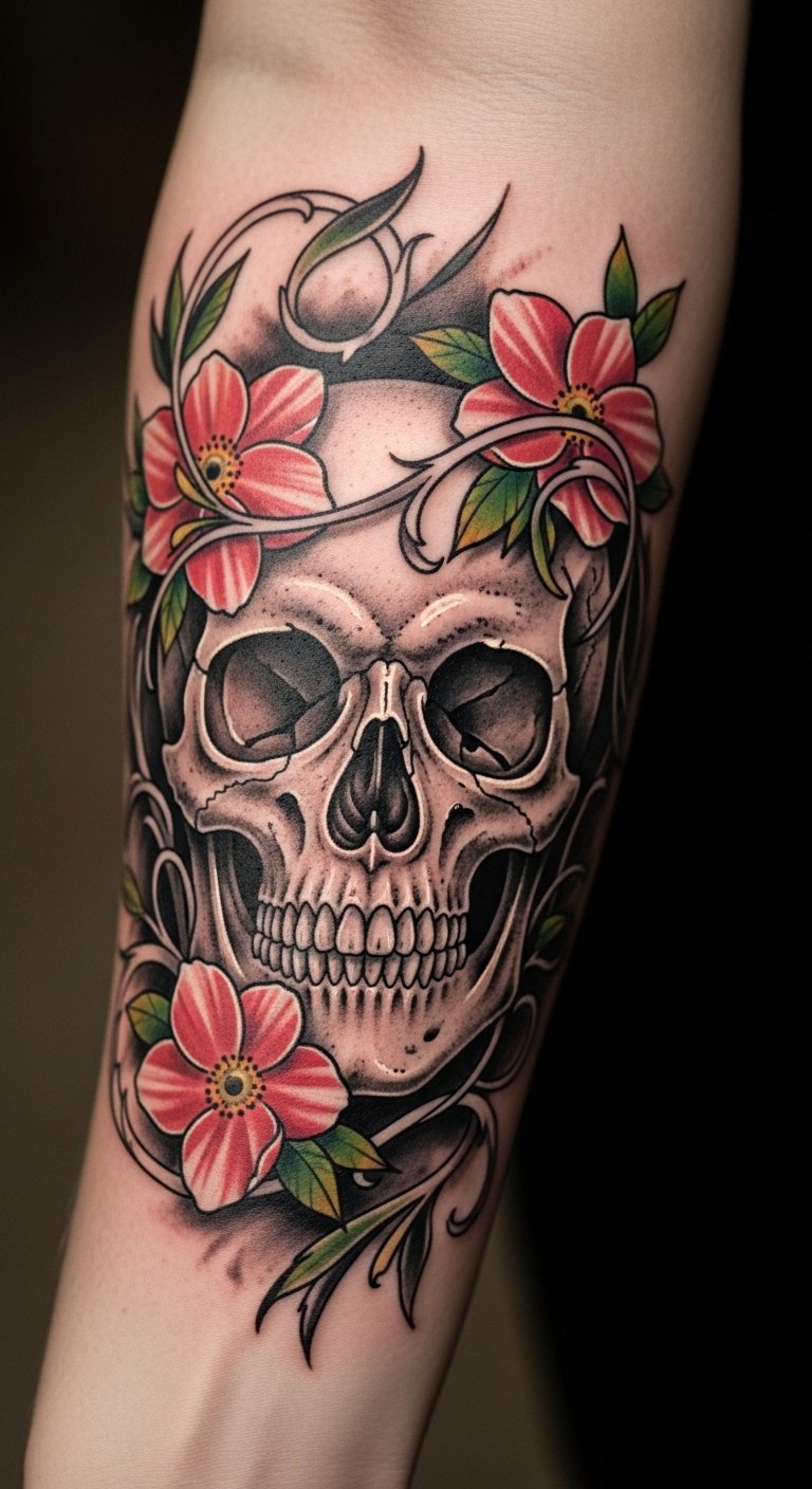 The floral elements intertwined with the skull evoke growth and renewal, reinforcing the idea that even in death, there’s beauty and life to be cherished.