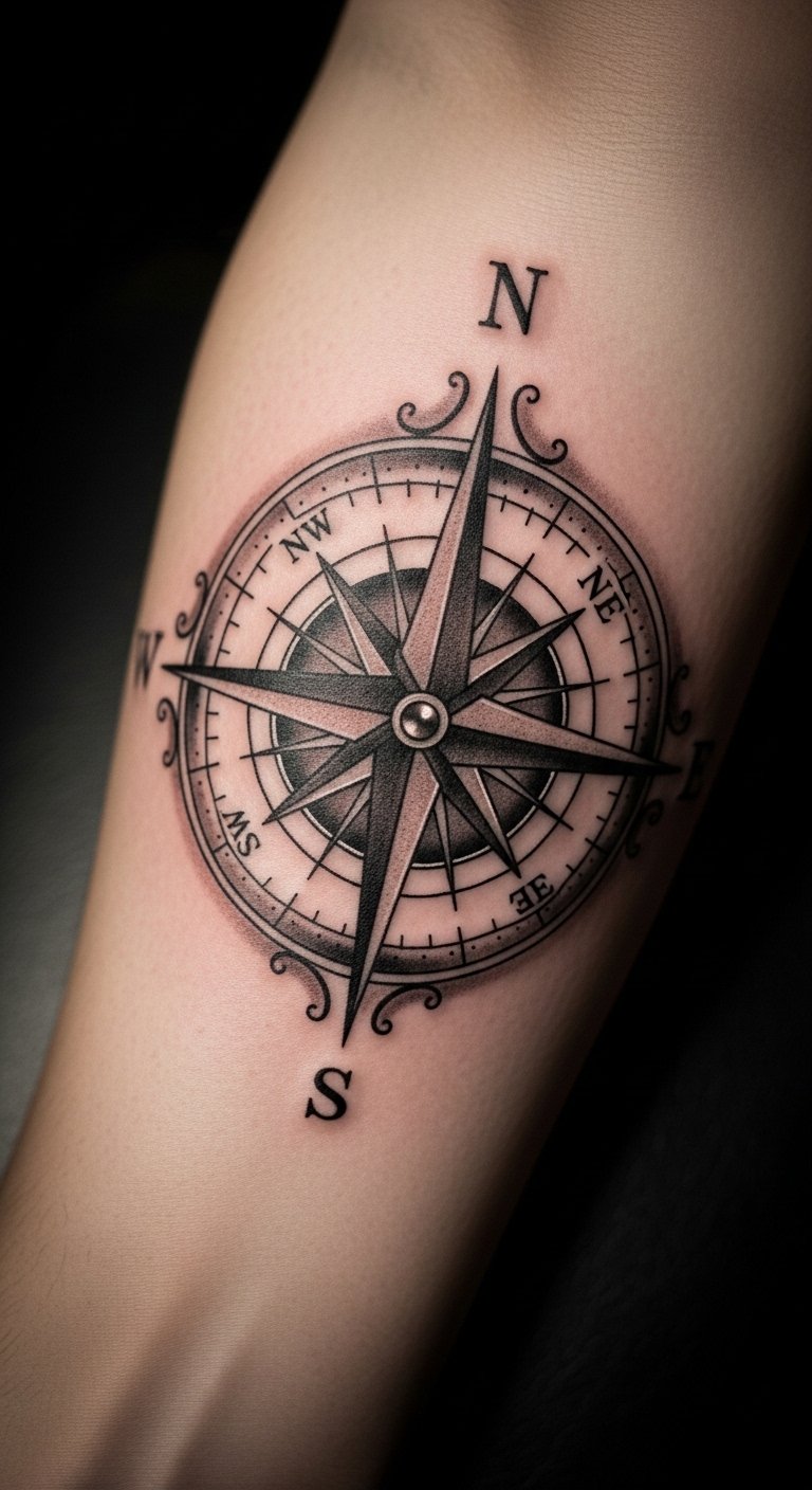 The compass tattoo on the forearm symbolizes guidance and the spirit of adventure, reminding the wearer to trust their instincts while exploring life’s journey.