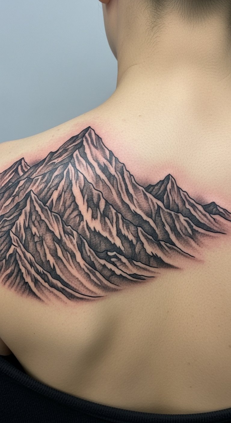 This mountain tattoo on the upper back symbolizes resilience and the journey through life’s challenges. Each peak serves as a reminder of personal strength and the ability to overcome obstacles.