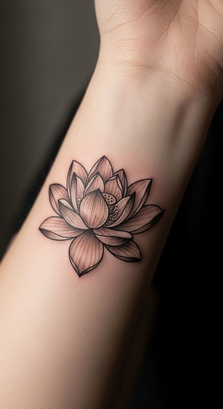 Positioned on the forearm, it serves as a constant reminder of one’s journey towards personal growth and enlightenment, allowing the wearer to connect with the rich cultural significance of the lotus in their daily life.