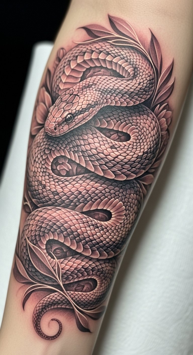 The coiling snake symbolizes resilience, and the added natural elements signify the beauty of renewal and spiritual awakening, making it a powerful reminder of inner strength.