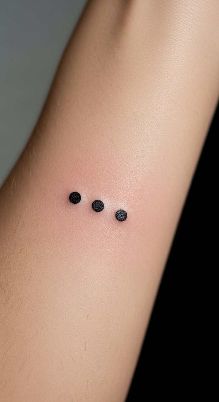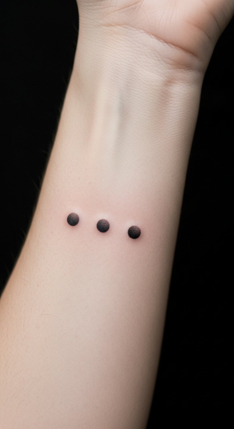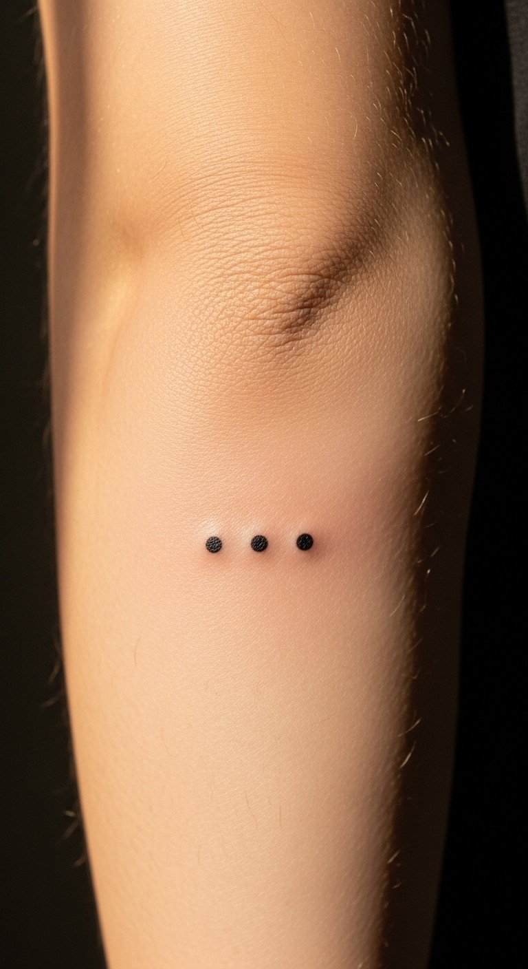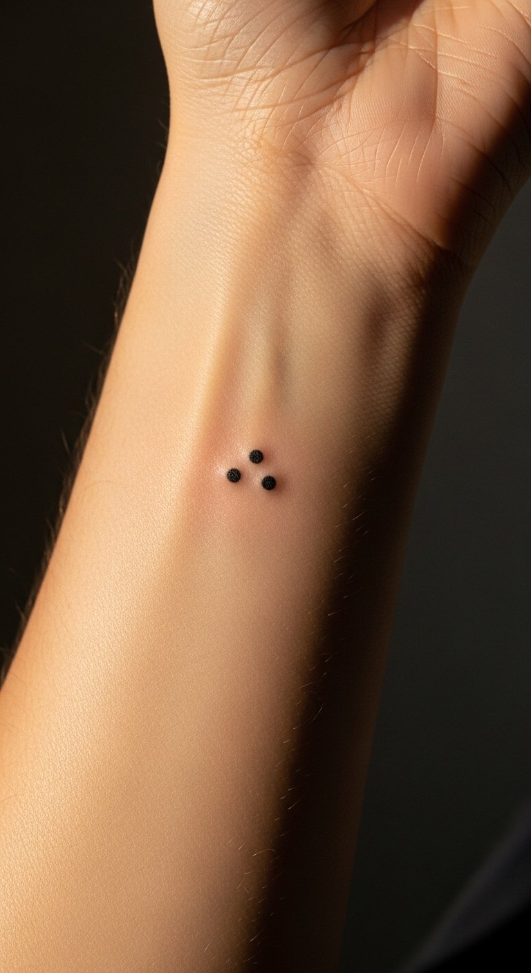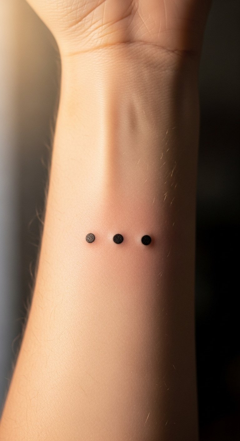 The three dots tattoo, placed on the inner forearm, symbolizes resilience and personal strength, inviting the wearer to embrace their life journey.