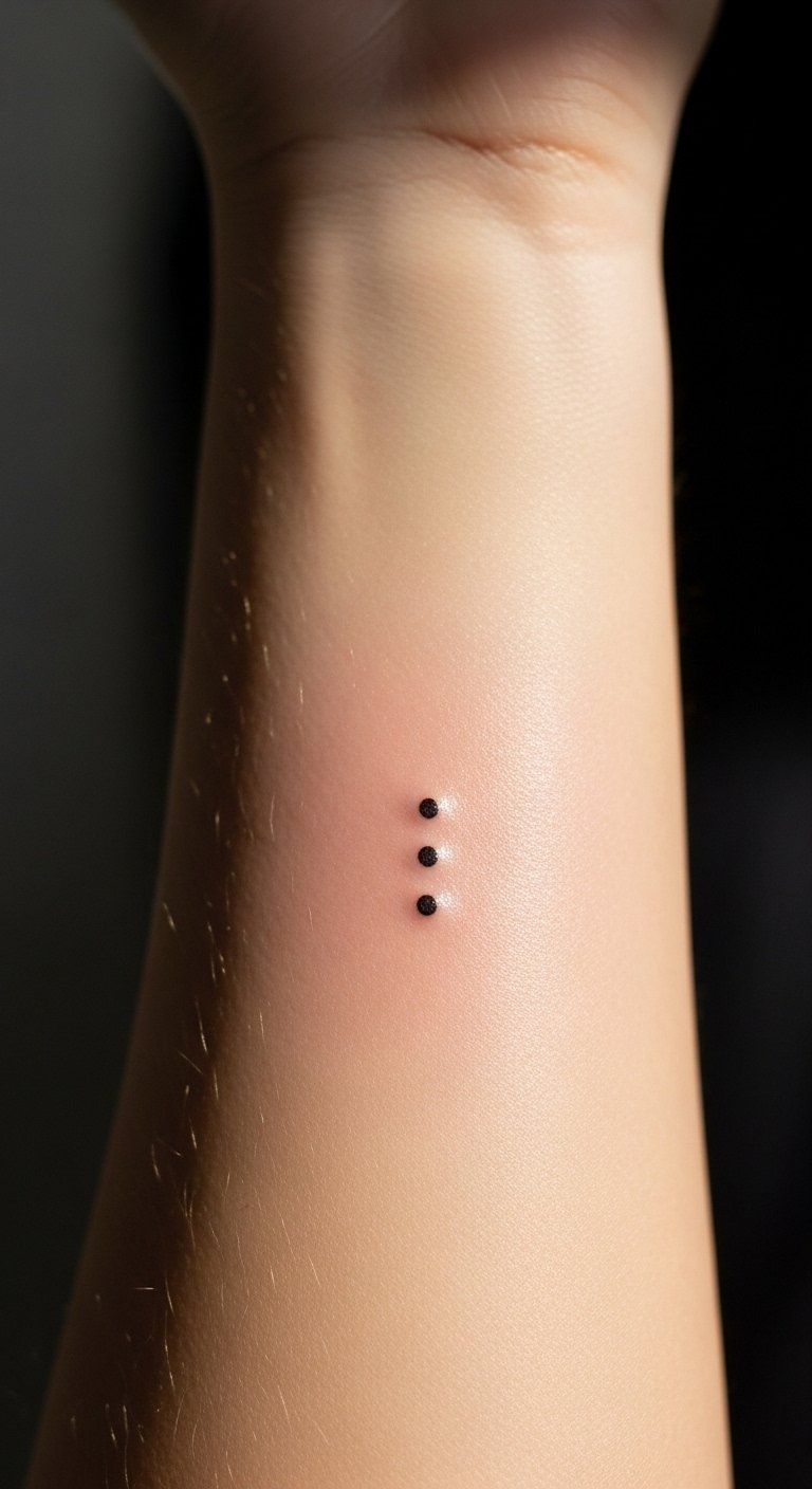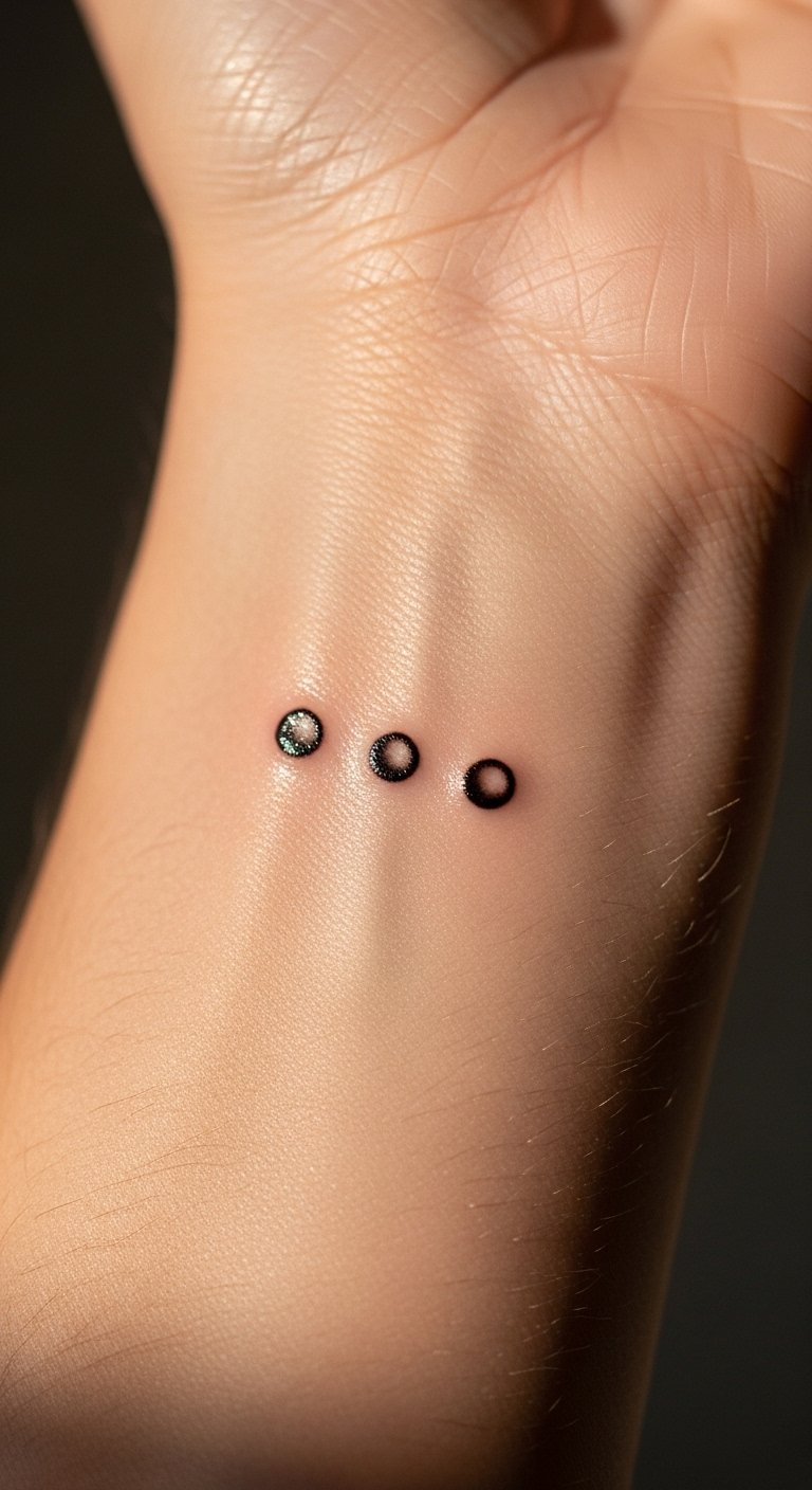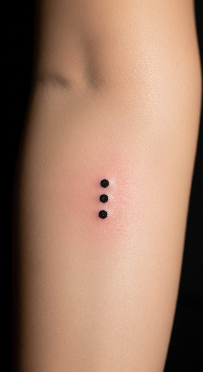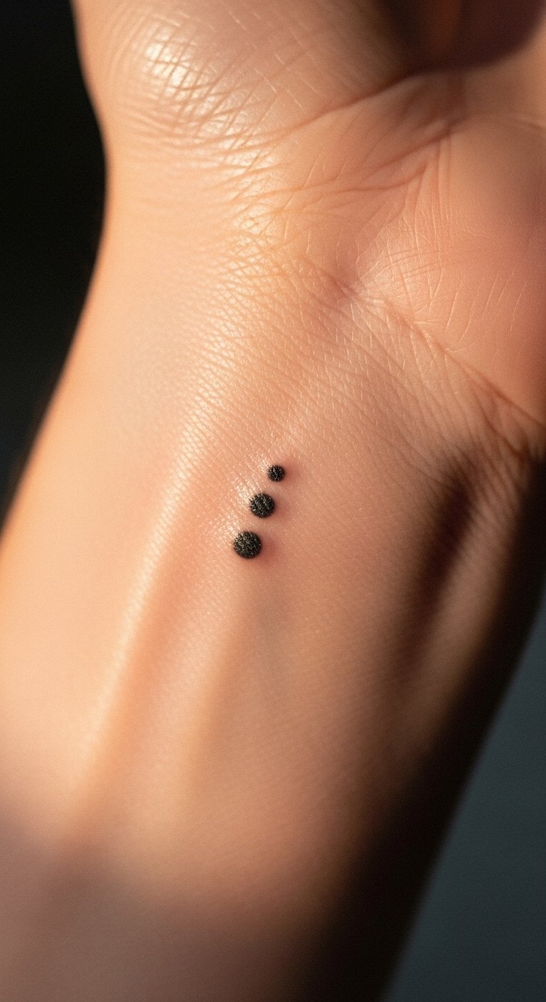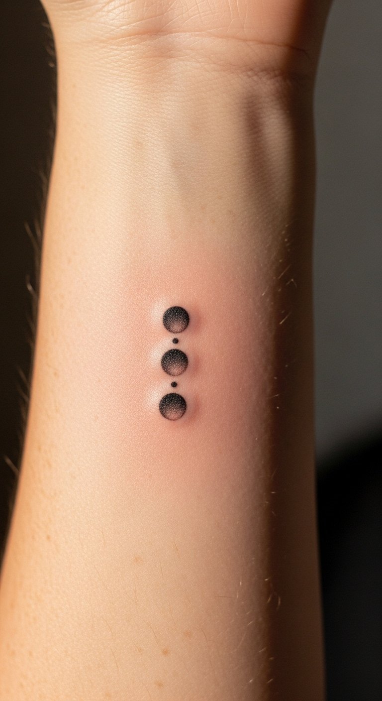 The three dots tattoo, placed on the inner forearm, symbolizes resilience and personal strength, inviting the wearer to embrace their life journey.