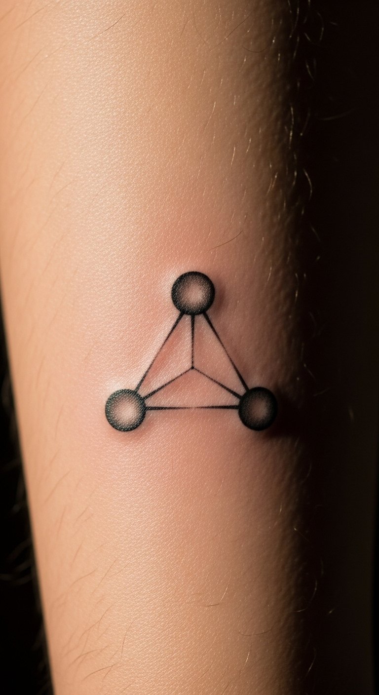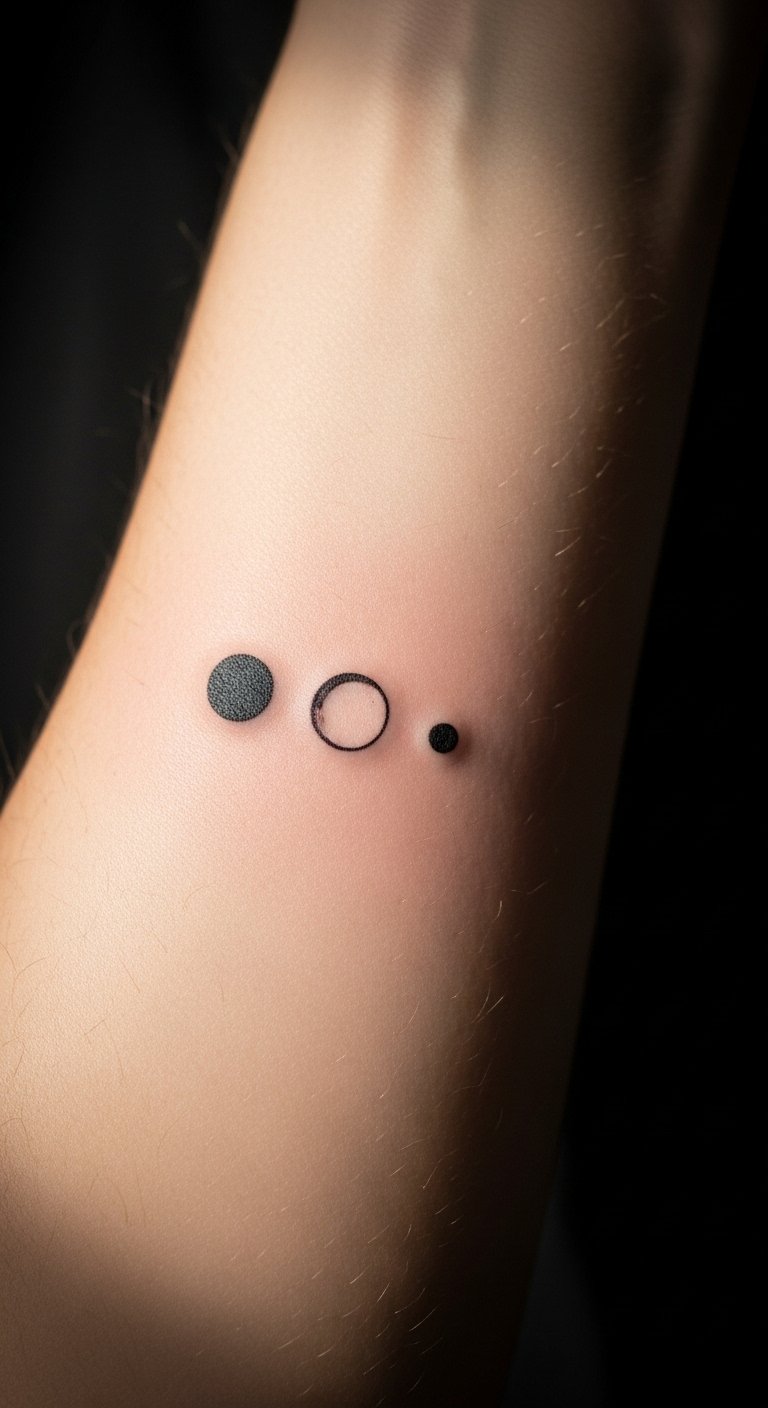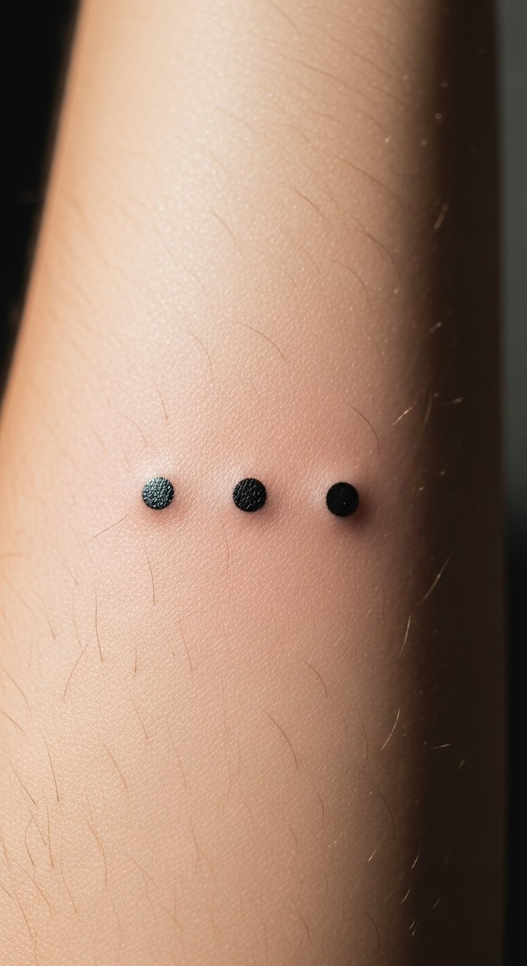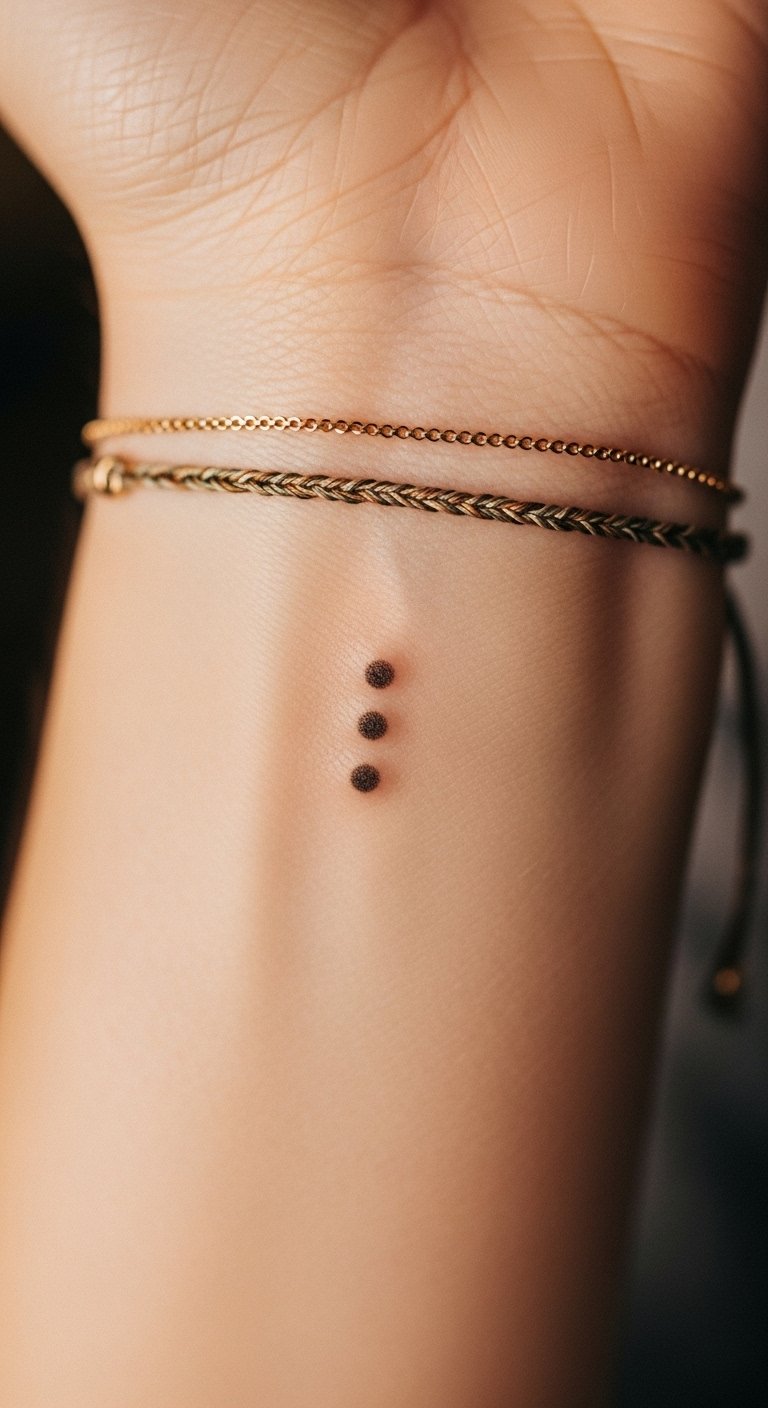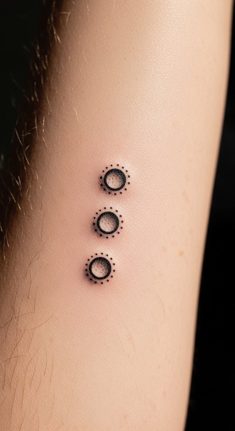 The three dots tattoo, placed on the inner forearm, symbolizes resilience and personal strength, inviting the wearer to embrace their life journey.