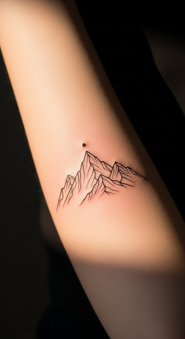Positioned on the inner forearm, it serves as a personal reminder of resilience and exploration. The minimalist design allows for deep personal reflection, encouraging the wearer to embrace their experiences while maintaining a sense of understated elegance.