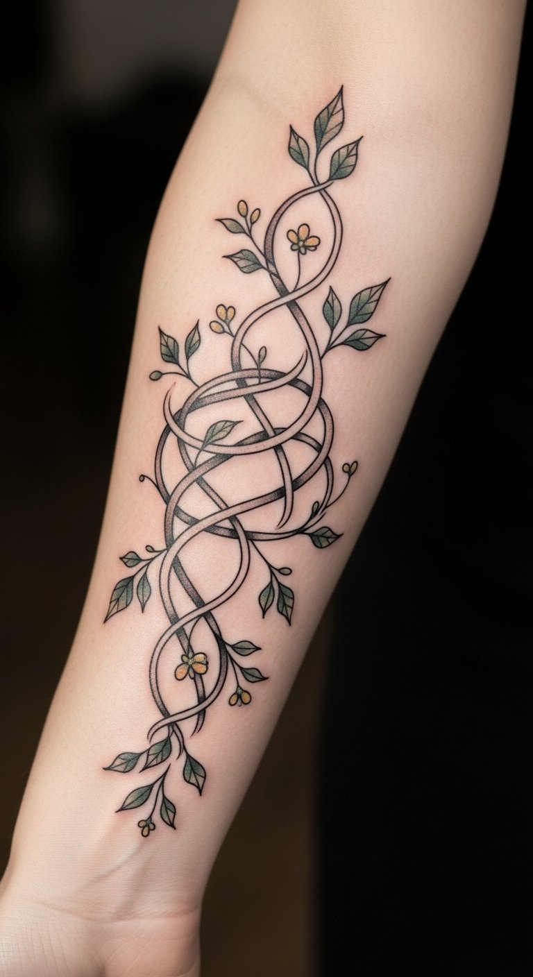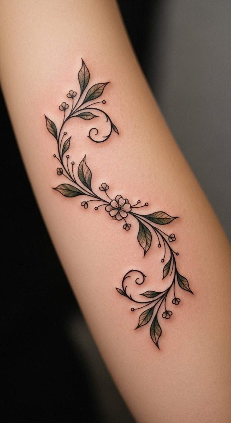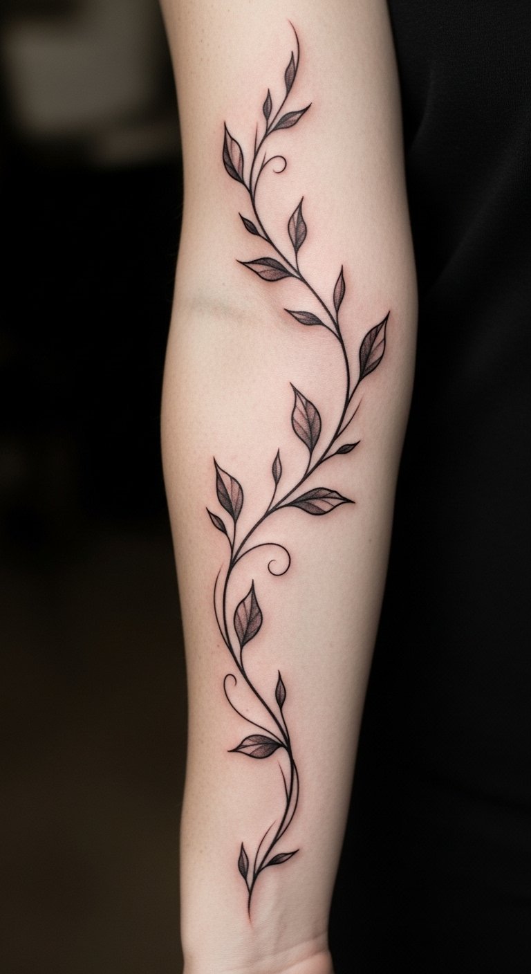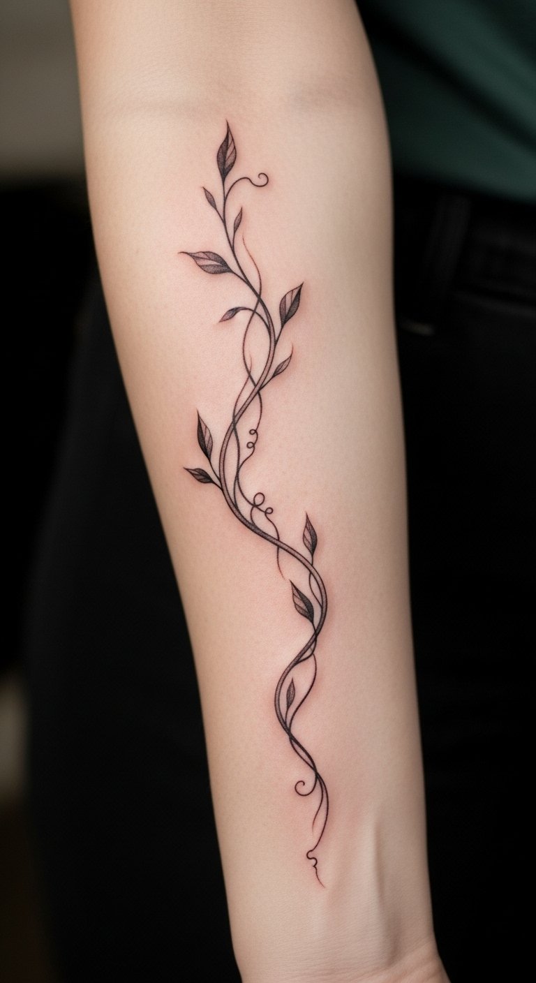 The placement on the forearm allows for visibility, serving as a daily reminder of the strength found in embracing one’s evolving self. Each twist and turn of the vine signifies the ups and downs of self-discovery, celebrating the beauty of transformation while remaining a personal mark of one’s unique story.