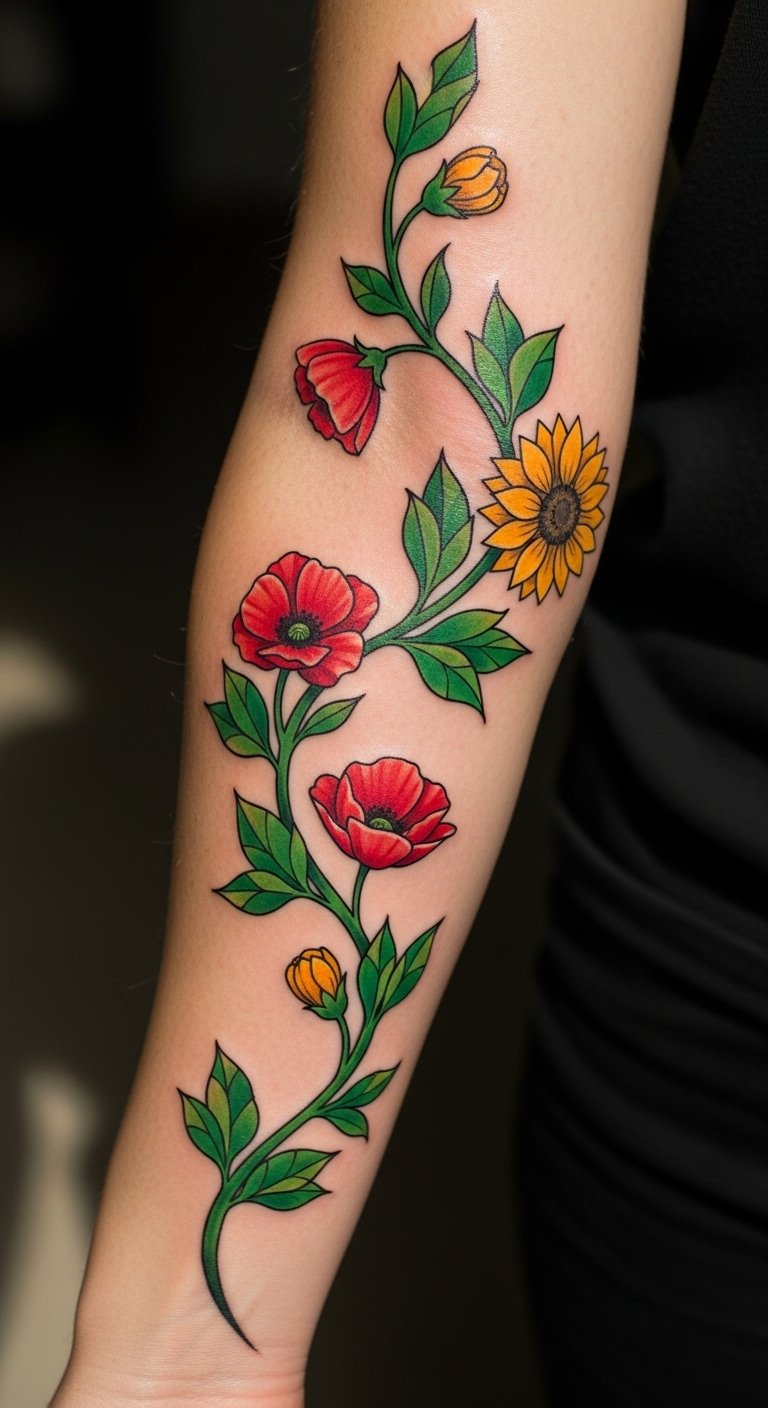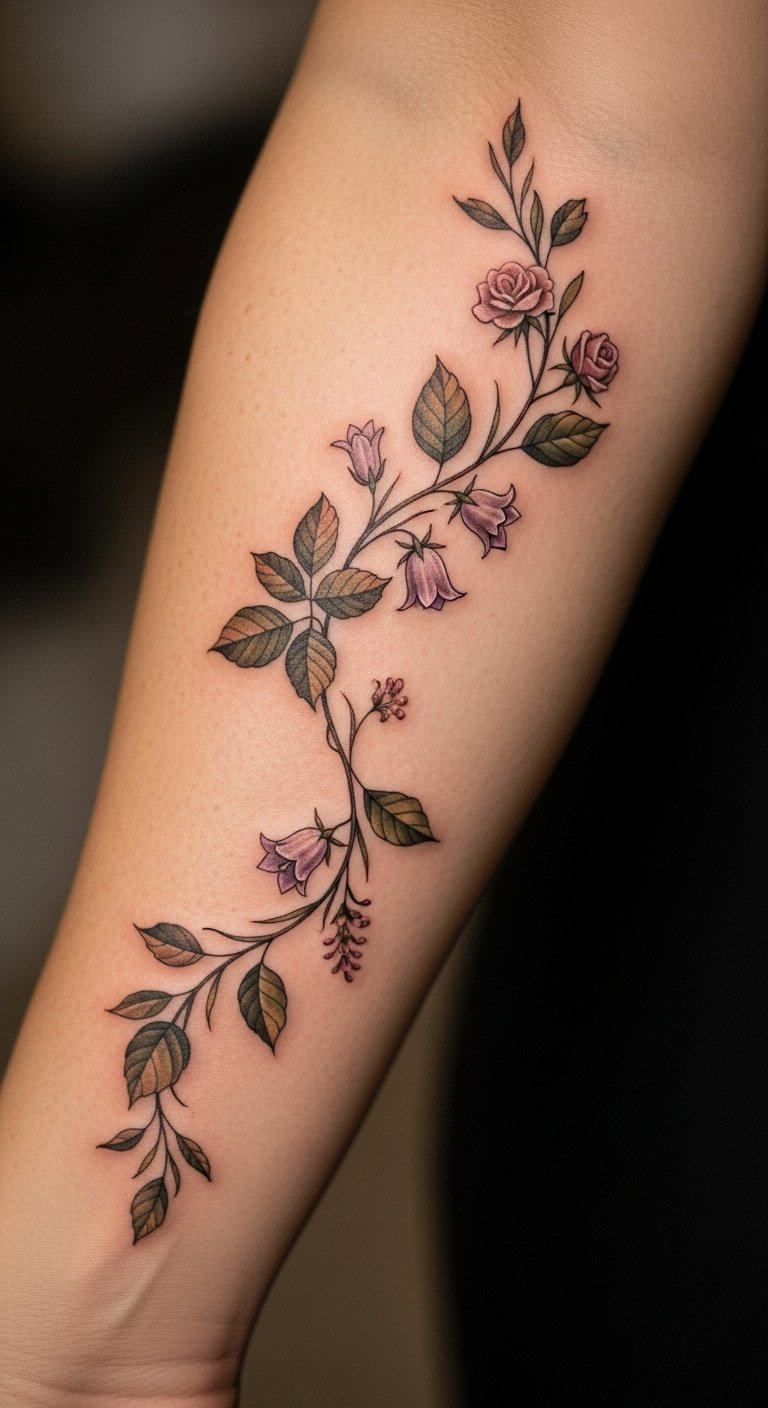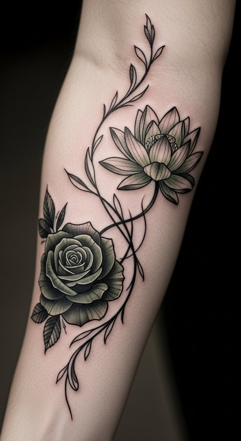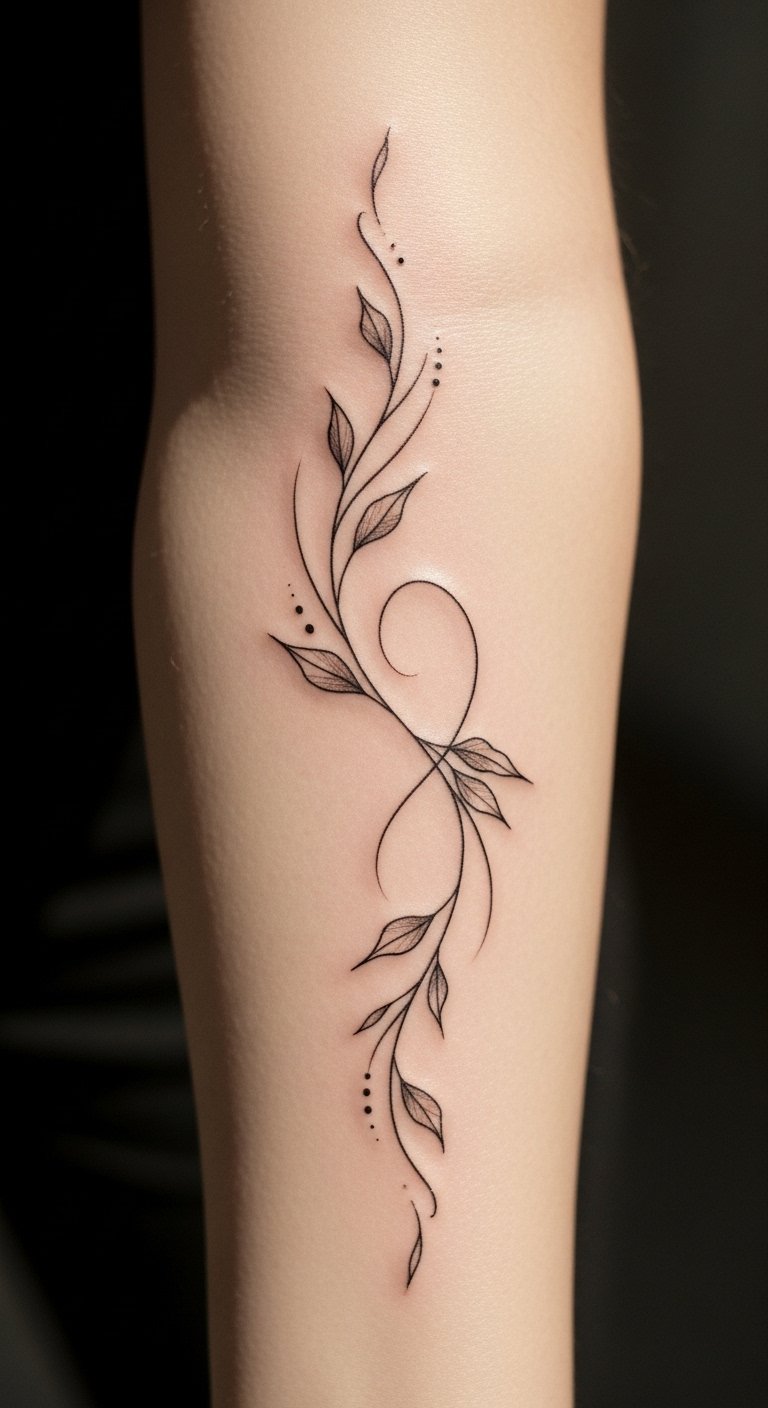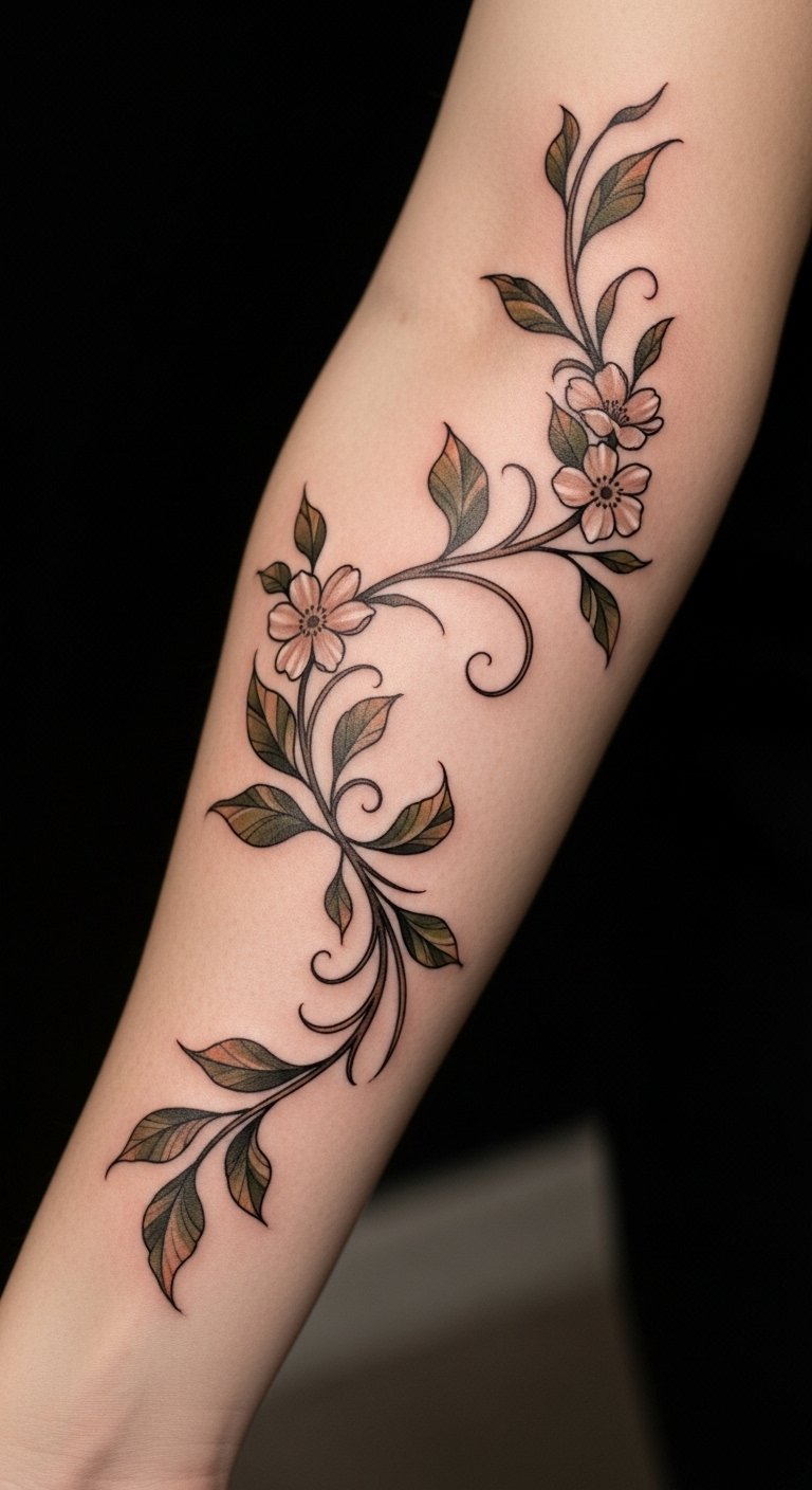 The placement on the forearm allows for visibility, serving as a daily reminder of the strength found in embracing one’s evolving self. Each twist and turn of the vine signifies the ups and downs of self-discovery, celebrating the beauty of transformation while remaining a personal mark of one’s unique story.