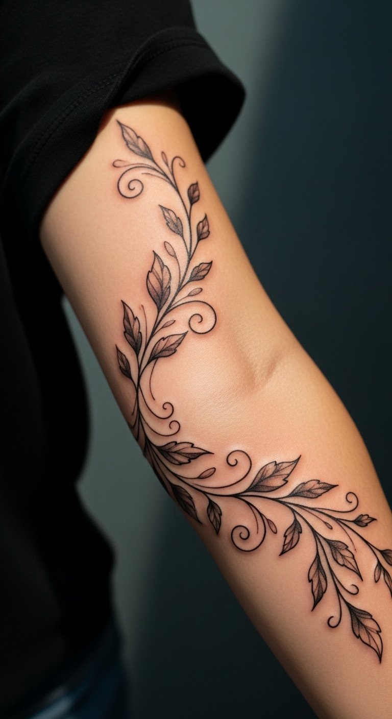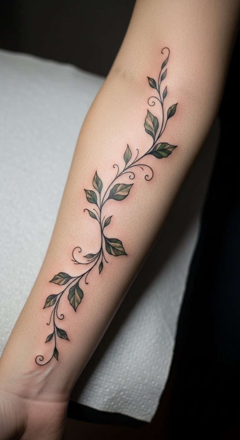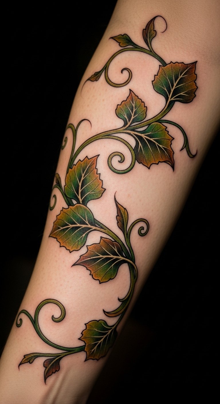 This vine tattoo symbolizes growth and renewal, reflecting the wearer’s personal journey and resilience through life’s changes.