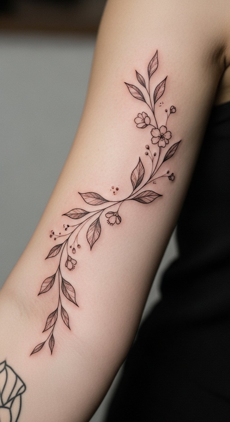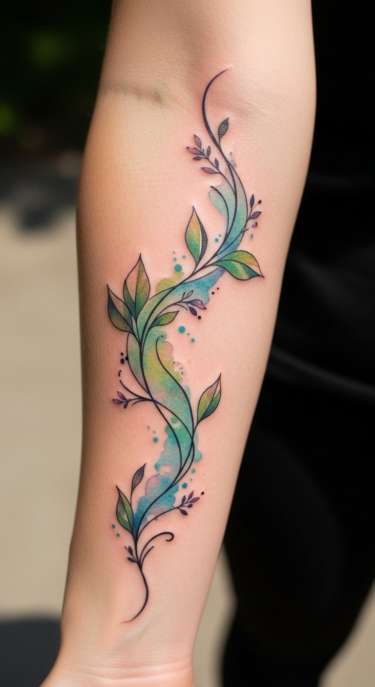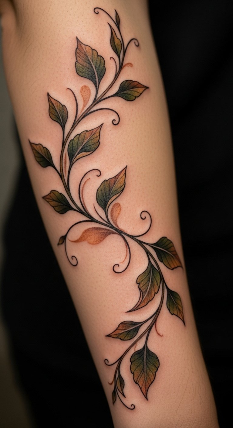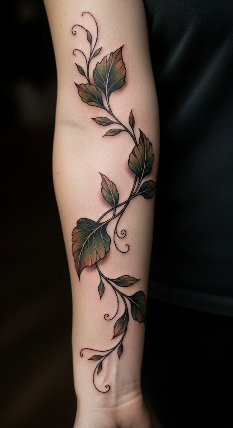 This vine tattoo symbolizes growth and renewal, reflecting the wearer’s personal journey and resilience through life’s changes.