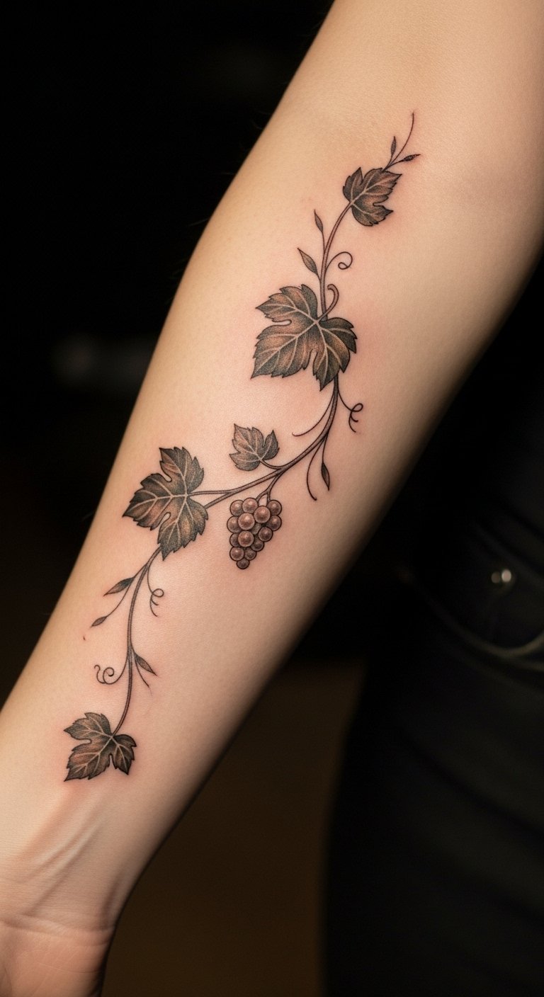 This tattoo symbolizes growth, connection, and the beauty of nature. Placed on the forearm, it serves as a reminder of one’s journey through life, echoing the resilience of vines that thrive in various environments.